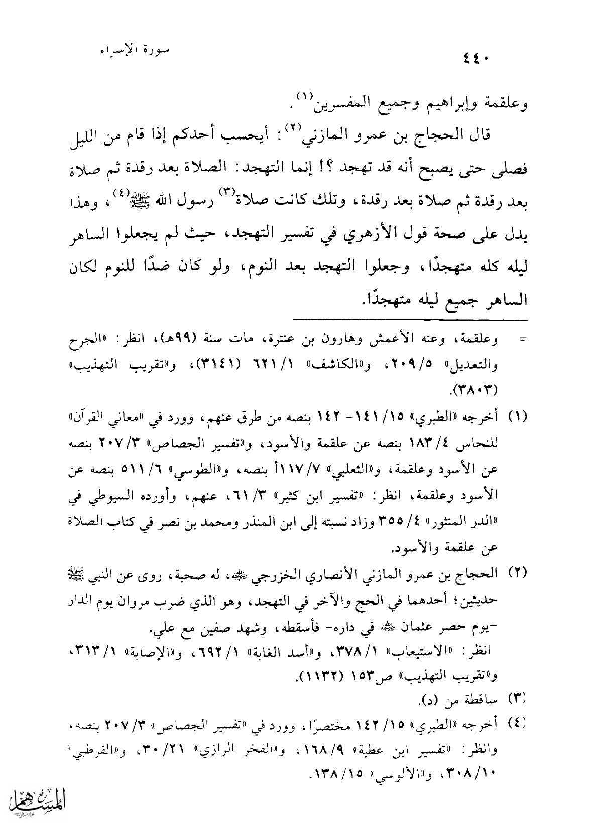 (¬1) أخرجه "الطبري" 15/ 141 - 142 بنصه من طرق عنهم، وورد في "معاني القرآن" للنحاس 4/ 183 بنصه عن علقمة والأسود، و"تفسير الجصاص" 7/ 203 بنصه عن الأسود وعلقمة، و"الثعلبي" 7/ 117 أبنصه، و"الطوسي" 6/ 511 بنصه عن الأسود وعلقمة، انظر: "تفسير ابن كثير" 3/ 61، عنهم، وأورده السيوطي في "الدر المنثور" 4/ 355 وزاد نسبته إلى ابن المنذر ومحمد بن نصر في كتاب الصلاة عن علقمة والأسود.