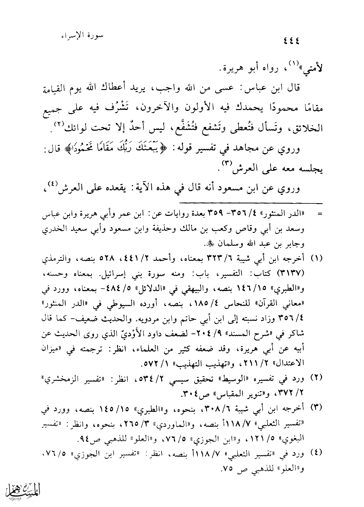 (¬1) أخرجه ابن أبي شيبة 6/ 323 بمعناه، وأحمد 2/ 441، 528 بنصه، والترمذي (3137) كتاب: التفسير، باب: ومنه سورة بني إسرائيل. بمعناه وحسنه، و"الطبري" 15/ 146 بنصه، والبيهقي في "الدلائل" 5/ 484 - بمعناه، وورد في "معاني القرآن" للنحاس 4/ 185، بنصه، أورده السيوطي في "الدر المنثور" 4/ 356 وزاد نسبته إلى ابن أبي حاتم وابن مردويه. والحديث ضعيف- كما قال شاكر في "شرح المسند" 9/ 204 - لضعف داود الأَوْديّ الذي روى الحديث عن أبيه عن أبي هريرة، وقد ضعفه كثير من العلماء، انظر: ترجمته في "ميزان الاعتدال" 2/ 211، و"تهذيب التهذيب" 1/ 572.