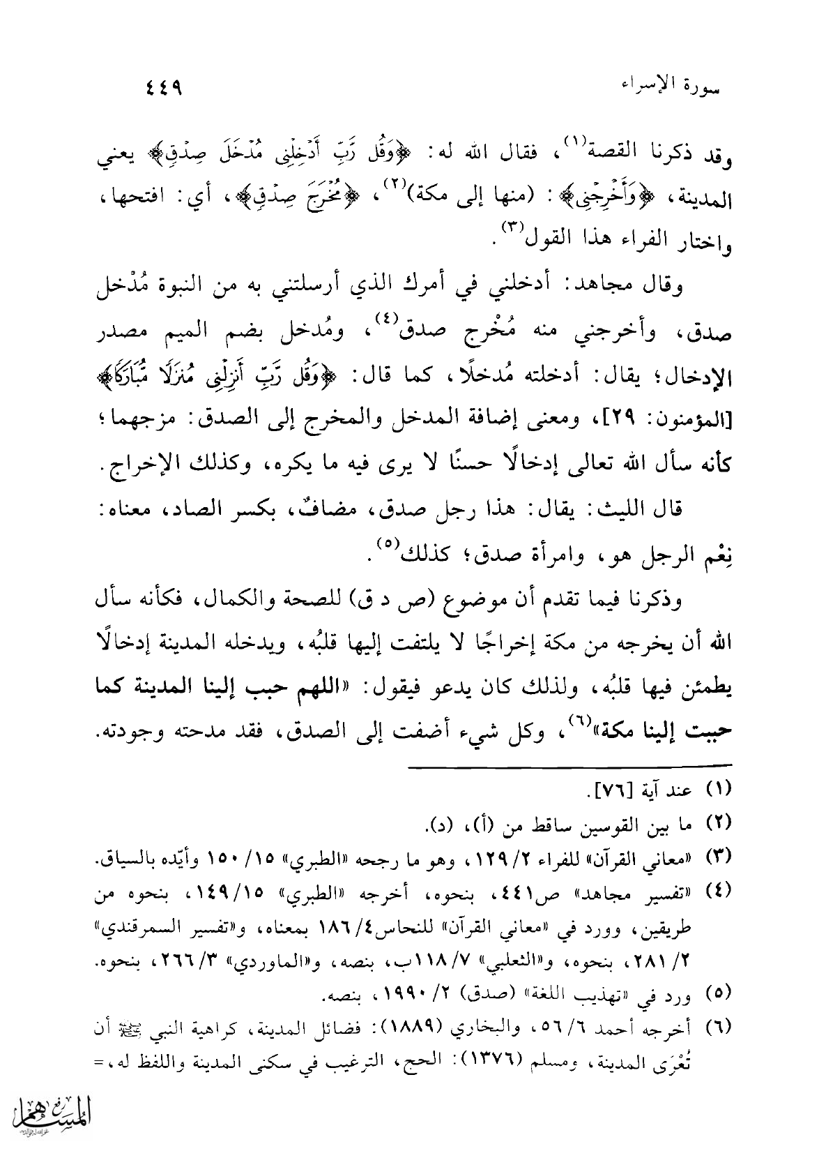 وذكرنا فيما تقدم أن موضوع (ص د ق) للصحة والكمال، فكأنه سأل الله أن يخرجه من مكة إخراجًا لا يلتفت إليها قلبُه، ويدخله المدينة إدخالًا يطمئن فيها قلبُه، ولذلك كان يدعو فيقول: "اللهم حبب إلينا المدينة كلما حببت إلينا مكة" (¬6)، وكل شيء أضفت إلى الصدق، فقد مدحته وجودته.