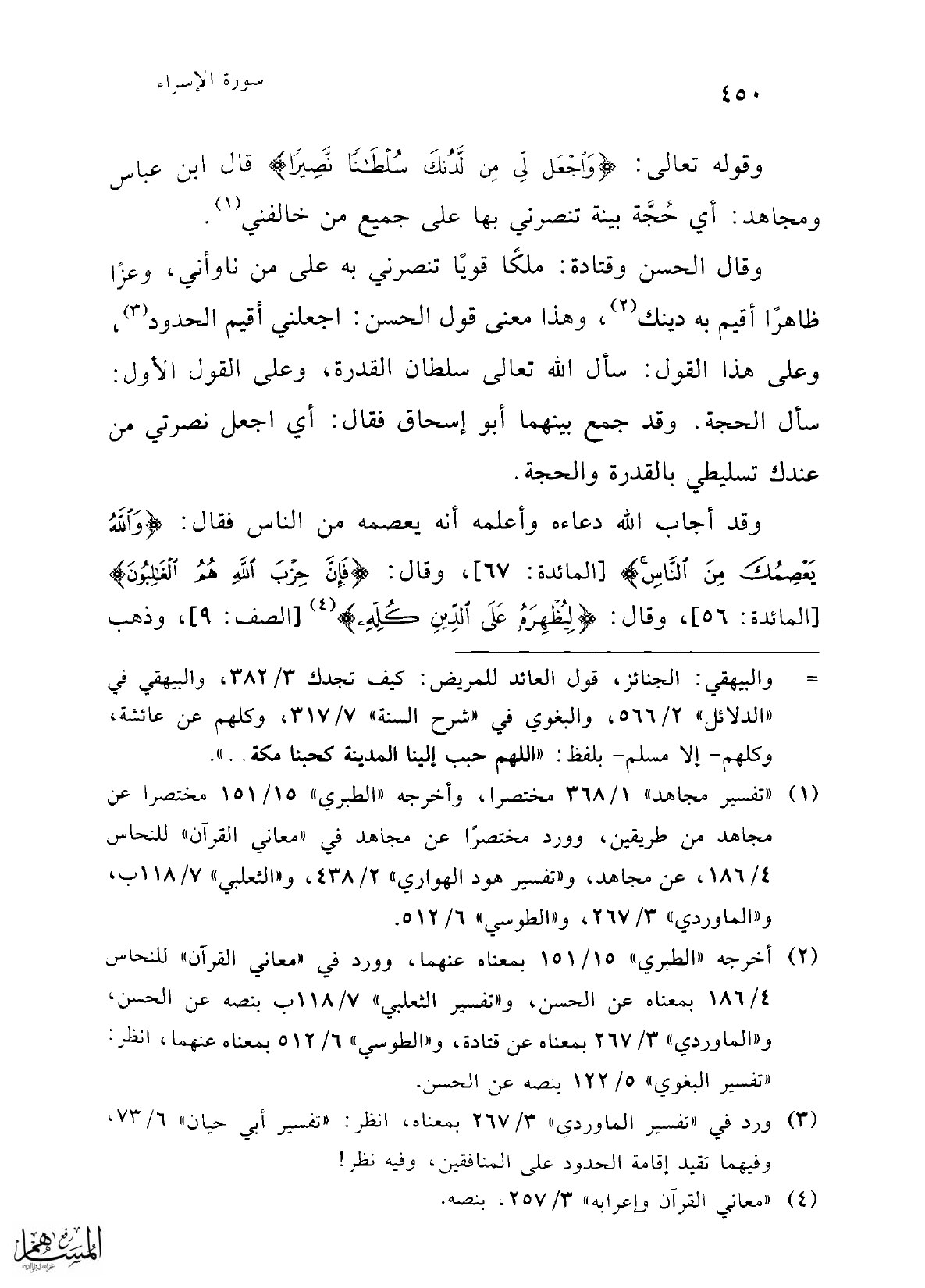 وقوله تعالى: {وَاجْعَلْ لِي مِنْ لَدُنْكَ سُلْطَانًا نَصِيرًا} قال ابن عباس ومجاهد: أي حُجَّة بينة تنصرني بها على جميع من خالفني (¬1).