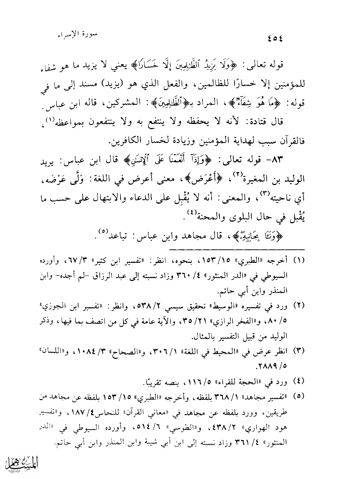 (¬5) "تفسير مجاهد" 1/ 368 بلفظه، وأخرجه "الطبري" 15/ 153 بلفظه عن مجاهد من طريقين، وورد بلفظه عن مجاهد في "معاني القرآن" للنحاس 4/ 187، و"تفسير هود الهواري" 2/ 438، و"الطوسي" 6/ 514، وأورده المسيوطى في "الدر المنثور" 4/ 361 وزاد نسبته إلى ابن أبي شيبة وابن المنذر وابن أبي حاتم.