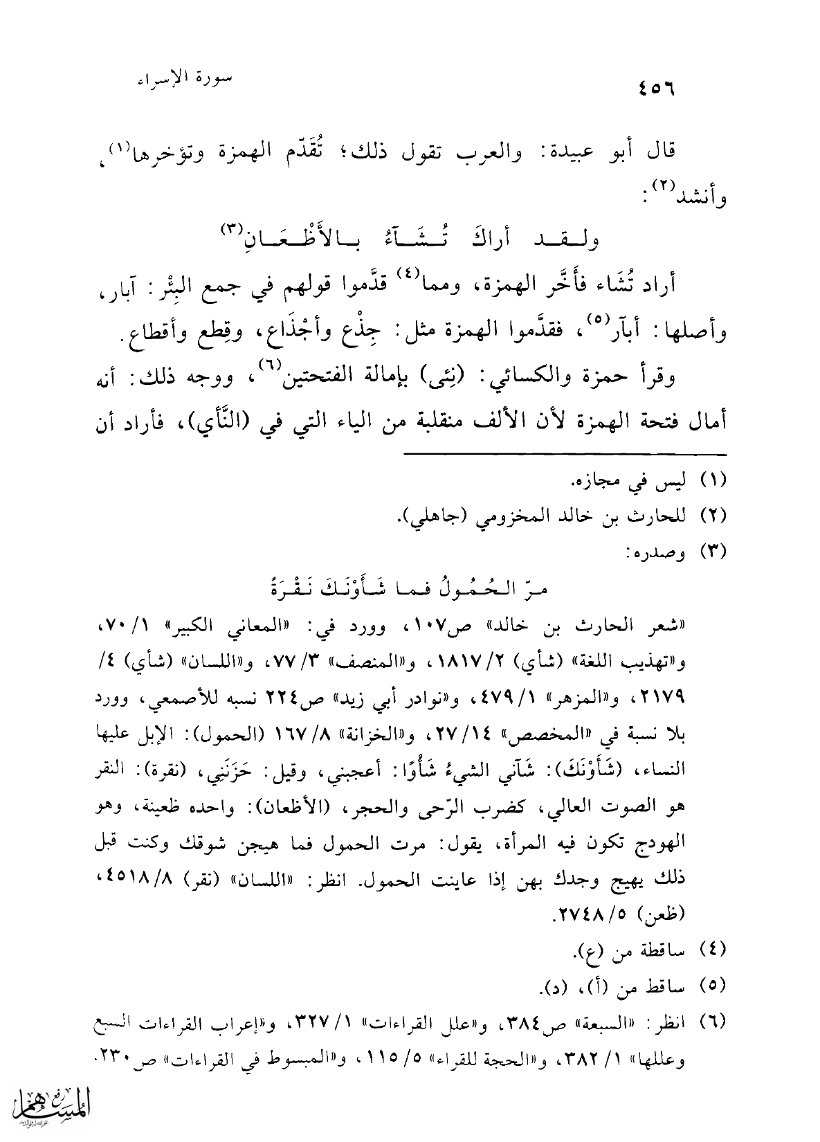 أراد تُشَاء فأَخَّر الهمزة، ومما (¬4) قدَّموا قولهم في جمع البِئْر: آبار، وأصلها: أبآر (¬5)، فقدَّموا الهمزة مثل: جِذْع وأجْذَاع، وقِطع وأقطاع.
