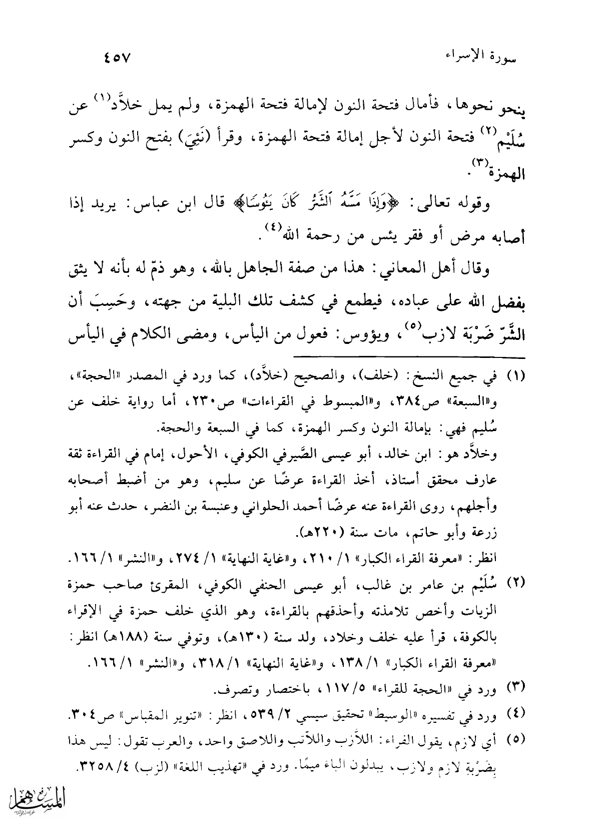 (¬1) في جميع النسخ: (خلف)، والصحيح (خلاَّد)، كما ورد في المصدر "الحجة"، و"السبعة" ص 384، و"المبسوط في القراءات" ص230، أما رواية خلف عن سُليم فهي: بإمالة النون وكسر الهمزة، كما في السبعة والحجة.