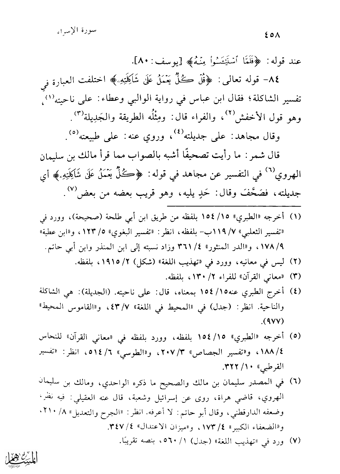 84 - قوله تعالى: {قُلْ كُلٌّ يَعْمَلُ عَلَى شَاكِلَتِهِ} اختلفت العبارة في تفسير الشاكلة؛ فقال ابن عباس في رواية الوالبي وعطاء: على ناحيته (¬1) , وهو قول الأخفش (¬2)، والفراء قال: ومِثْلُه الطريقة والجَدِيلة (¬3).