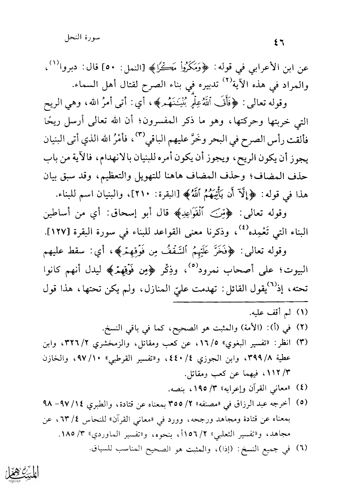 وقوله تعالي: {فَأَتَى اللَّهُ بُنْيَانَهُمْ}، أي: أتى أمرُ الله، وهي الريح التي خربتها وحركتها، وهو ما ذكر المفسرون؛ أن الله تعالى أرسل ريحًا فألقت رأس الصرح في البحر وخَرَّ عليهم الباقي (¬3)، فأمْرُ الله الذي أتى البنيان يجوز أن يكون الريح، ويجوز أن يكون أمره للبنيان بالانهدام، فالآية من باب حذف المضاف؛ وحذف المضاف هاهنا للتهويل والتعظيم، وقد سبق بيان هذا في قوله: {إِلَّا أَنْ يَأْتِيَهُمُ اللَّهُ} [البقرة: 210]، والبنيان اسم للبناء.
