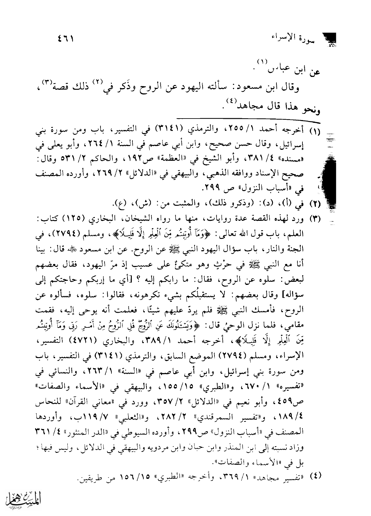 (¬3) ورد لهذه القصة عدة روايات، منها ما رواه الشيخان، البخاري (125) كتاب: العلم، باب قول الله تعالى: {وَمَا أُوتِيتُمْ مِنَ الْعِلْمِ إِلَّا قَلِيلًا}، ومسلم (2794)، في الجنة والنار، باب سؤال اليهود النبي -صلى الله عليه وسلم- عن الروح. عن ابن مسعود -رضي الله عنه- قال: بينا أنا مع النبي -صلى الله عليه وسلم- في حرث وهو متكئٌ على عسيب إذ مرّ اليهود، فقال بعضهم لبعض: سلوه عن الروح، فقال: ما رابكم إليه؟ [أي ما إربكم وحاجتكم إلى سؤاله] وقال بعضهم: لا يستقبلُكم بشيء تكرهونه، فقالوا: سلوه، فسألوه عن الروح، فأمسك النبي -صلى الله عليه وسلم- فلم يردّ عليهم شيئًا، فعلمت أنه يوحى إليه، فقمت مقامي، فلما نزل الوحيُ قال: {وَيَسْأَلُونَكَ عَنِ الرُّوحِ قُلِ الرُّوحُ مِنْ أَمْرِ رَبِّي وَمَا أُوتِيتُمْ مِنَ الْعِلْمِ إِلَّا قَلِيلًا}، أخرجه أحمد 1/ 389، والبخاري (4721) التفسير، الإسراء، ومسلم (2794) الموضع السابق، والترمذي (3141) في التفسير، باب ومن سورة بني إسرائيل، وابن أبي عاصم في "السنة" 1/ 263، والنسائي في "تفسيره" 1/ 670، و"الطبري" 15/ 155، والبيهقي في "الأسماء والصفات" ص 459، وأبو نعيم في "الدلائل" 2/ 357، وورد في "معاني القرآن" للنحاس 4/ 189، و"تفسير السمرقندي" 2/ 282، و"الثعلبي" 7/ 119 ب، وأوردها المصنف في "أسباب النزول" ص 299، وأورده السيوطي في "الدر المنثور" 4/ 361 وزاد نسبته إلى ابن المنذر وابن حبان وابن مردويه والبيهقي في الدلائل, وليس فيها؛ بل في "الأسماء والصفات".