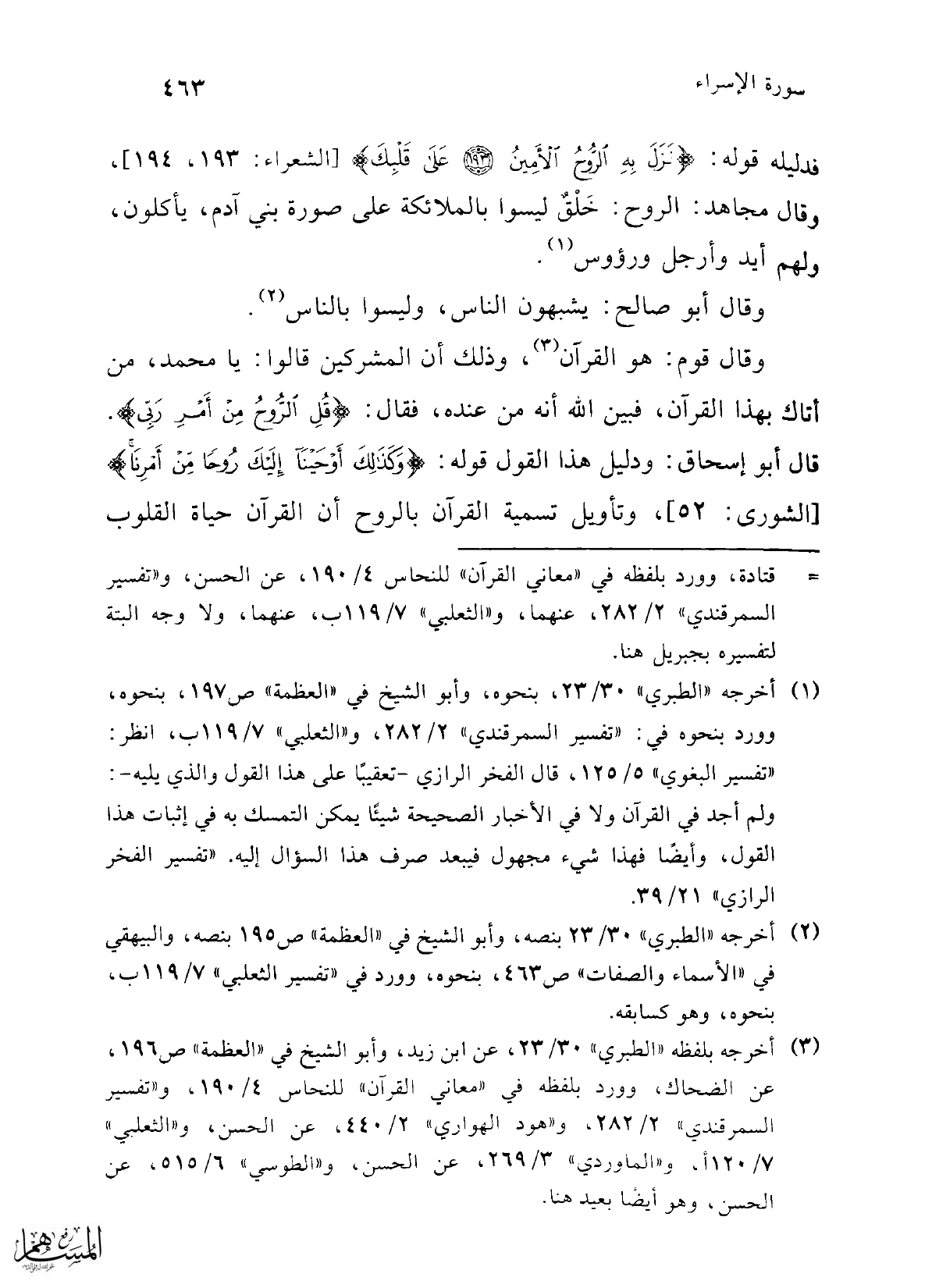 (¬1) أخرجه "الطبري" 30/ 23، بنحوه، وأبو الشيخ في "العظمة" ص 197، بنحوه، وورد بنحوه في: "تفسير السمرقندي" 2/ 282، و"الثعلبي" 7/ 119 ب، انظر: "تفسير البغوي" 5/ 125، قال الفخر الرازي -تعقيبًا على هذا القول والذي يليه-: ولم أجد في القرآن ولا في الأخبار الصحيحة شيئًا يمكن التمسك به في إثبات هذا القول، وأيضًا فهذا شيء مجهول فيبعد صرف هذا السؤال إليه. "تفسير الفخر الرازي" 21/ 39.