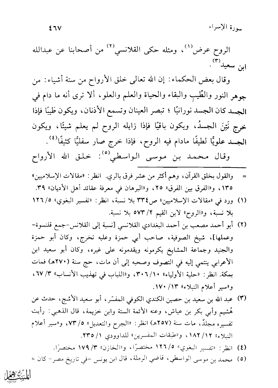 الروح عرض (¬1)، ومثله حكى القلانسي (¬2) من أصحابنا عن عبد الله ابن سعيد (¬3).