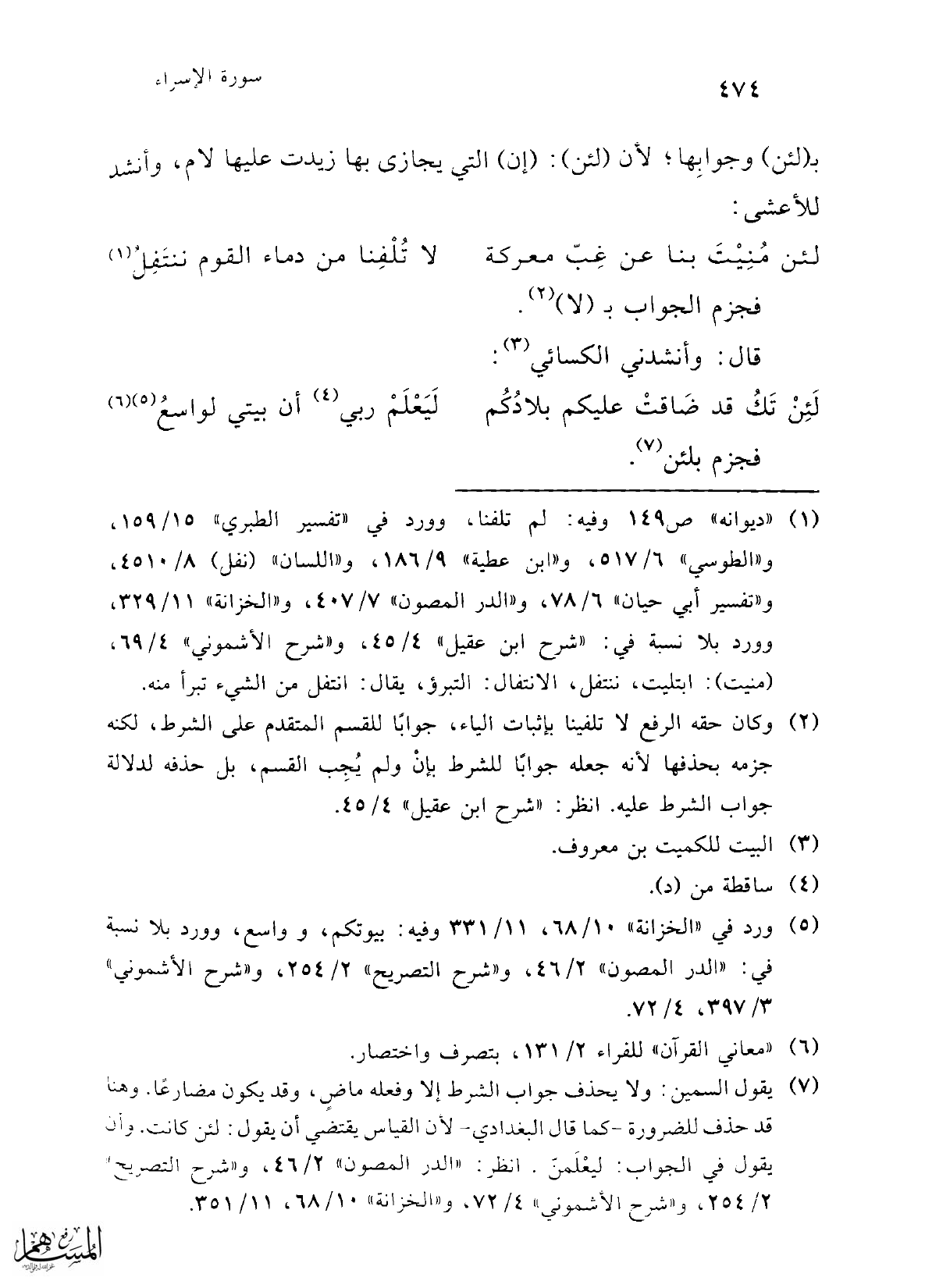 (¬7) يقول السمين: ولا يحذف جواب الشرط إلا وفعله ماضٍ، وقد يكون مضارعًا. وهنا قد حذف للضرورة -كما قال البغدادي- لأن القياس يقتضي أن يقول: لئن كانت. وأن يقول في الجواب؛ ليعْلَمنّ. انظر: "الدر المصون" 2/ 46,و"شرح التصريح" 2/ 254, و"شرح الأشموني" 4/ 72 , و"الخزانة" 10/ 68 , 11/ 351.