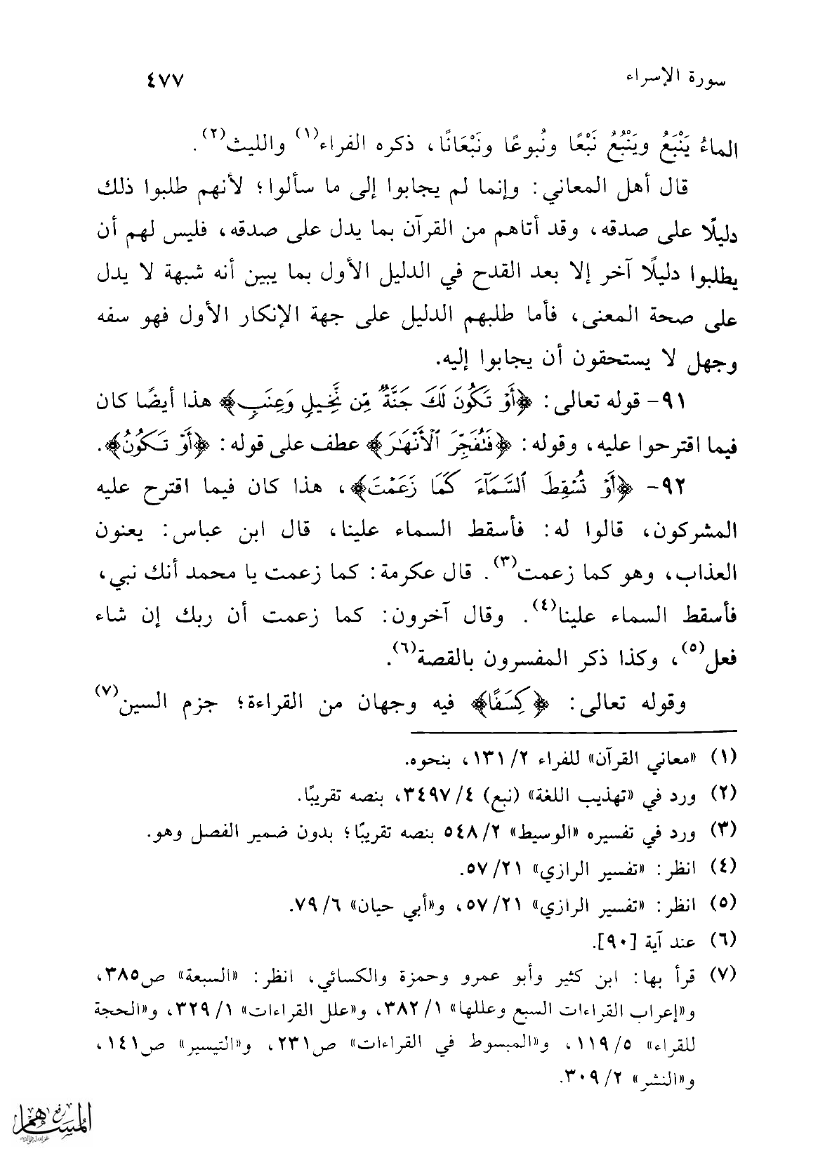 92 - {أَوْ تُسْقِطَ السَّمَاءَ كَمَا زَعَمْتَ}، هذا كان فيما اقترح عليه المشركون، قالوا له: فأسقط السماء علينا، قال ابن عباس: يعنون العذاب، وهو كما زعمت (¬3). قال عكرمة: كما زعمت يا محمد أنك نبي، فأسقط السماء علينا (¬4). وقال آخرون: كما زعمت أن ربك إن شاء فعل (¬5)، وكذا ذكر المفسرون بالقصة (¬6).
