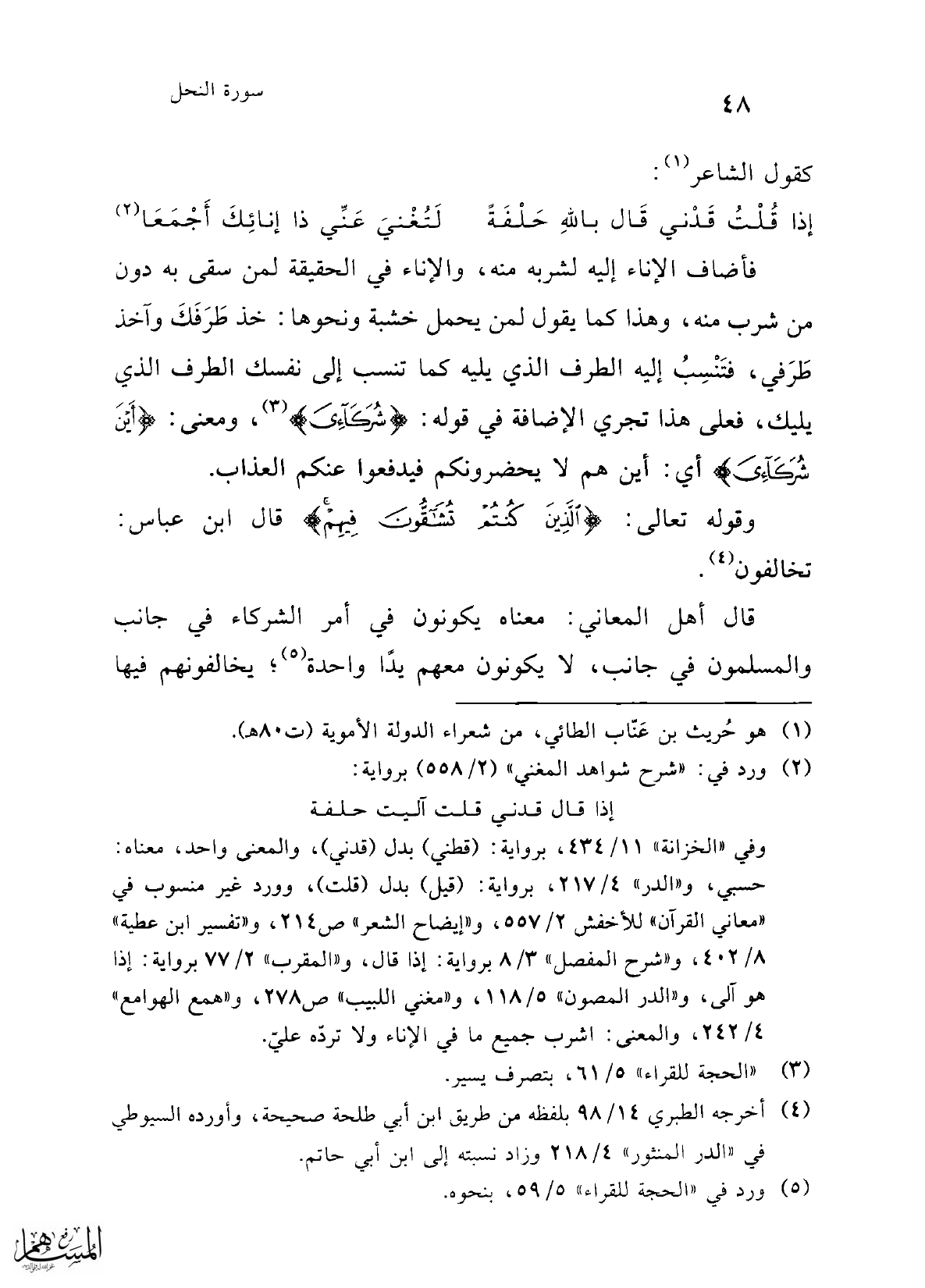 فأضاف الإناء إليه لشربه منه، والإناء في الحقيقة لمن سقى به دون من شرب منه، وهذا كما يقول لمن يحمل خشبة ونحوها: خذ طَرَفَكَ وآخذ طَرَفي، فتَنْسِبُ إليه الطرف الذي يليه كم تنسب إلى نفسك الطرف الذي يليك، فعلى هذا تجري الإضافة في قوله: {شُرَكَائِيَ} (¬3)، ومعنى: {أَيْنَ شُرَكَائِيَ} أي: أين هم لا يحضرونكم فيدفعوا عنكم العذاب.