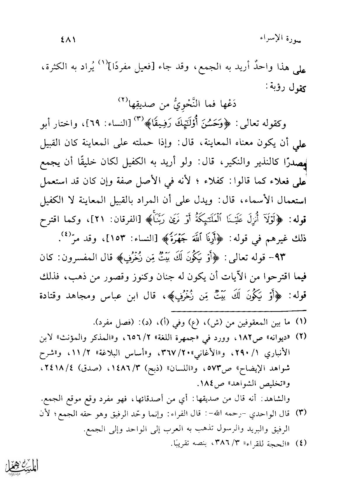 (¬3) قال الواحدي -رحمه الله-: قال الفراء: وإنما وحّد الرفيق وهو حقه الجمع؛ لأن الرفيق والبريد والرسول تذهب به العرب إلى الواحد وإلى الجمع.
