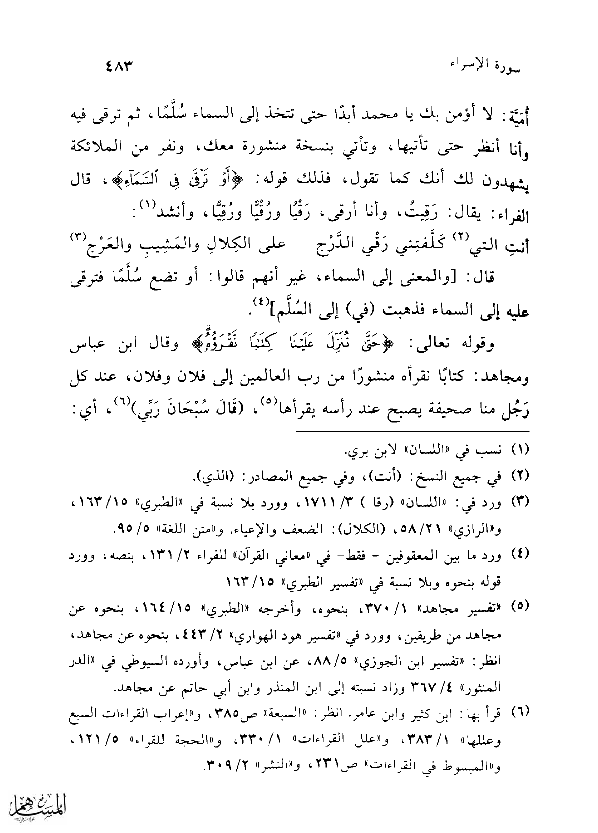 أُمَيَّة: لا أؤمن بك يا محمد أبدًا حتى تتخذ إلى السماء سُلَّمًا، ثم ترقى فيه وأنا انظر حتى تأتيها، وتأتي بنسخة منشورة معك، ونفر من الملائكة يشهدون لك أنك كما تقول، فذلك قوله: {أَوْ تَرْقَى فِي السَّمَاءِ}، قال الفراء: يقال: رَقِيتُ، وأنا أرقى، رَقْيُا ورُقْيًّا ورُقِيًّا، وأنشد (¬1):