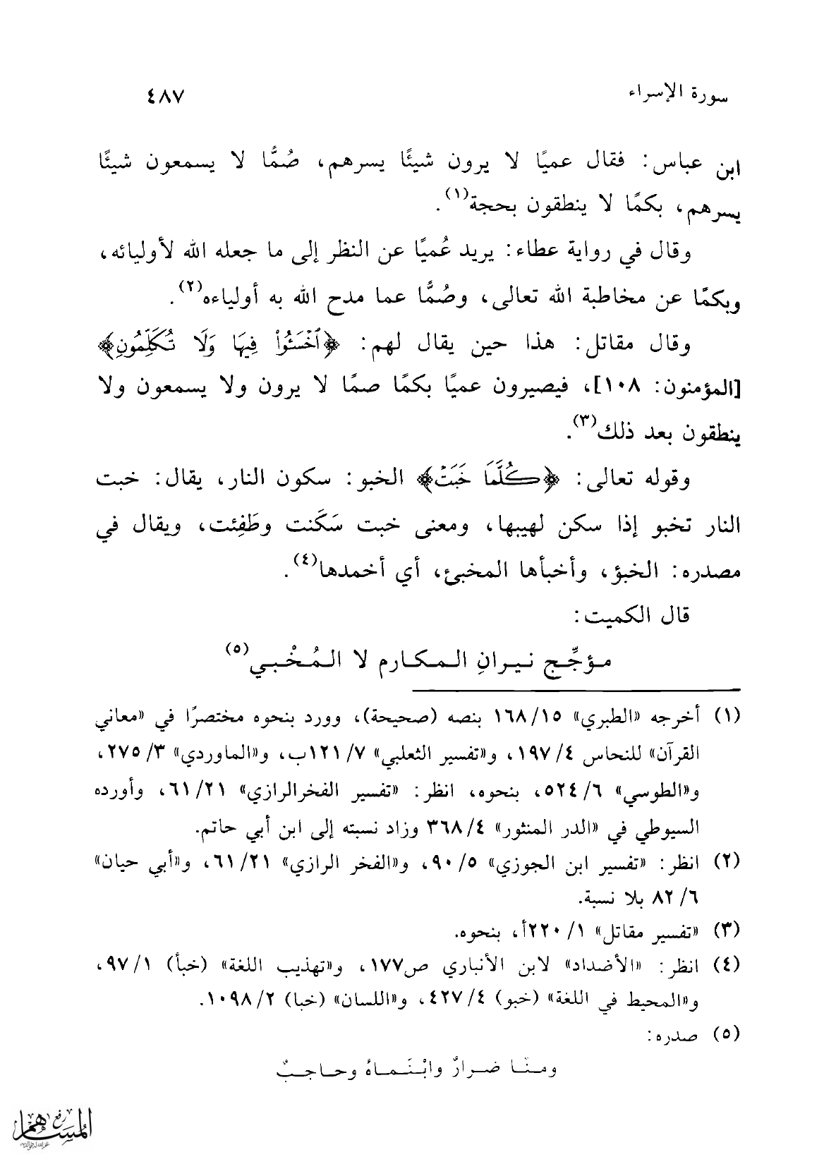 ابن عباس: فقال عميًا لا يرون شيئًا يسرهم، صُمًّا لا يسمعون شيئًا يسرهم، بكمًا لا ينطقون بحجة (¬1).