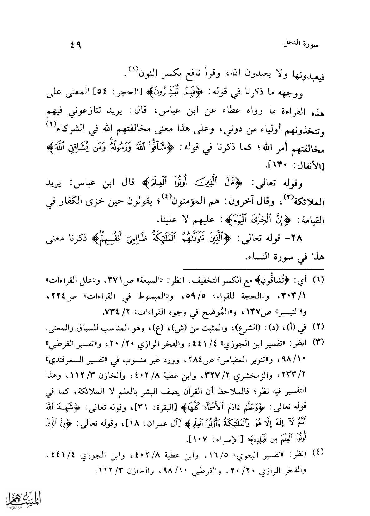 (¬3) انظر: "تفسير ابن الجوزي" 4/ 441، والفخر الرازي 20/ 20، و"تفسير القرطبي" 10/ 98، و"تنوير المقباس" ص 284، وورد غير منسوب في "تفسير السمرقندي" 2/ 233، والزمخشري 2/ 327، وابن عطية 8/ 402، والخازن 3/ 112، وهذا التفسير فيه نظر؛ فالملاحظ أن القرآن يصف البشر بالعلم لا الملائكة، كما في قوله تعالى: {وَعَلَّمَ آدَمَ الْأَسْمَاءَ كُلَّهَا} [البقرة: 31]، وقوله تعالى: {شَهِدَ اللَّهُ أَنَّهُ لَا إِلَهَ إِلَّا هُوَ وَالْمَلَائِكَةُ وَأُولُو الْعِلْمِ} [آل عمران: 18]، وقوله تعالى: {إِنَّ الَّذِينَ أُوتُوا الْعِلْمَ مِنْ قَبْلِهِ} [الإسراء: 107].