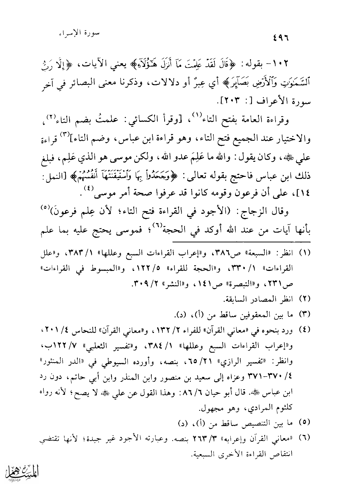 وقراءة العامة بفتح التاء (¬1)، [وقرأ الكسائي: علمتُ بضم التاء (¬2)، والاختيار عند الجميع فتح التاء، وهو قراءة ابن عباس، وضم التاء] (¬3) قراءة علي -رضي الله عنه-، وكان يقول: والله ما عَلِمَ عدو الله، ولكن موسى هو الذي عَلِم، فبلغ ذلك ابن عباس فاحتج بقوله تعالى: {وَجَحَدُوا بِهَا وَاسْتَيْقَنَتْهَا أَنْفُسُهُمْ} [النمل: 14]، على أن فرعون وقومه كانوا قد عرفوا صحة أمر موسى (¬4).