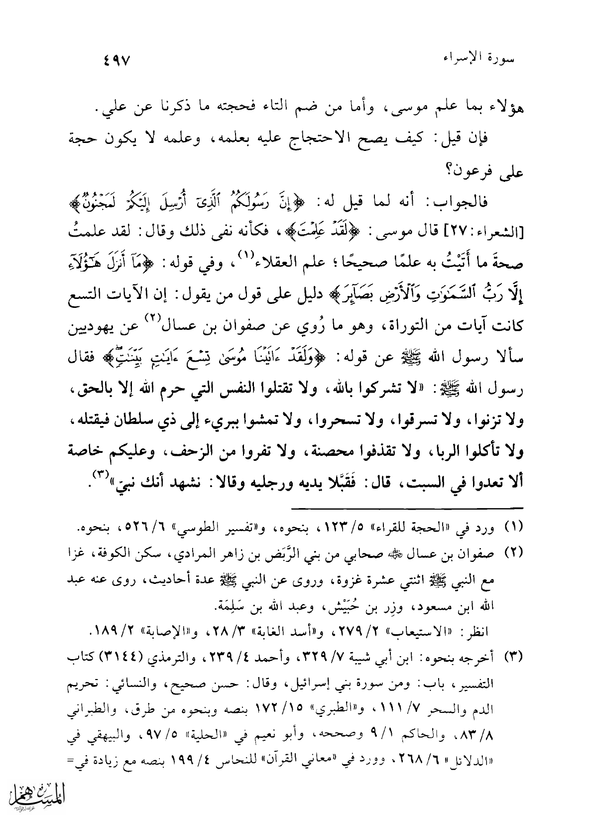 فالجواب: أنه لما قيل له: {إِنَّ رَسُولَكُمُ الَّذِي أُرْسِلَ إِلَيْكُمْ لَمَجْنُونٌ} [الشعراء: 27]، قال موسى: {لَقَدْ عَلِمْتَ}، فكأنه نفى ذلك وقال: لقد علمتُ صحةَ ما أَتَيْتُ به علمًا صحيحاً؛ علم العقلاء (¬1)، وفي قوله: {مَا أَنْزَلَ هَؤُلَاءِ إِلَّا رَبُّ السَّمَاوَاتِ وَالْأَرْضِ بَصَائِرَ} دليل على قول من يقول: إن الآيات التسع كانت آيات من التوراة، وهو ما رُوي عن صفوان بن عسال (¬2) عن يهوديين سألا رسول الله -صلى الله عليه وسلم- عن قوله: {وَلَقَدْ آتَيْنَا مُوسَى تِسْعَ آيَاتٍ بَيِّنَاتٍ} فقال رسول الله -صلى الله عليه وسلم-: "لا تشركوا بالله، ولا تقتلوا النفس التي حرم الله إلا بالحق، ولا تزنوا، ولا تسرقوا، ولا تسحروا، ولا تمشوا ببريء إلى ذي سلطان فيقتله، ولا تأكلوا الربا, ولا تقذفوا محصنة، ولا تفروا من الزحف، وعليكم خاصة ألا تعدوا في السبت، قال؛ فَقَبَّلا يديه ورجليه وقالا: نشهد أنك نبيّ" (¬3).