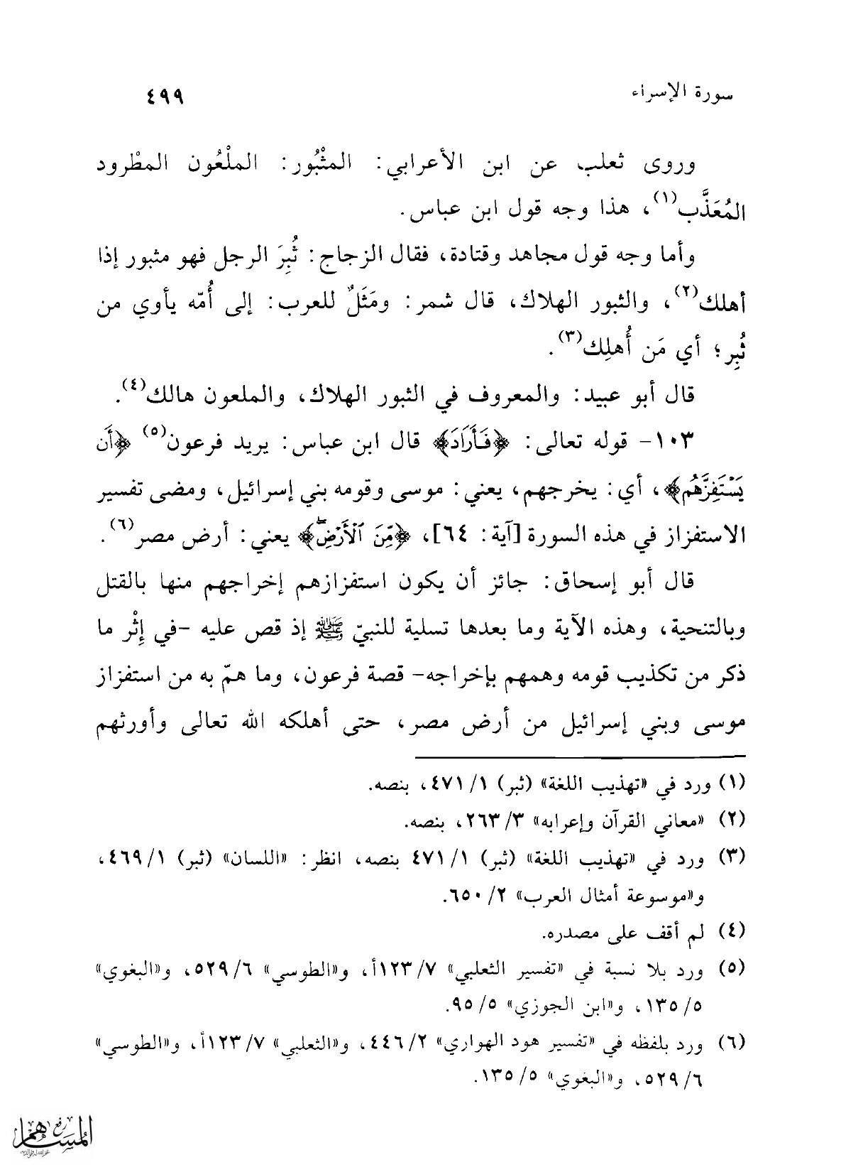 وروى ثعلب عن ابن الأعرابي: المثْبُور: الملْعُون المطْرود المُعَذَّب (¬1)، هذا وجه قول ابن عباس.