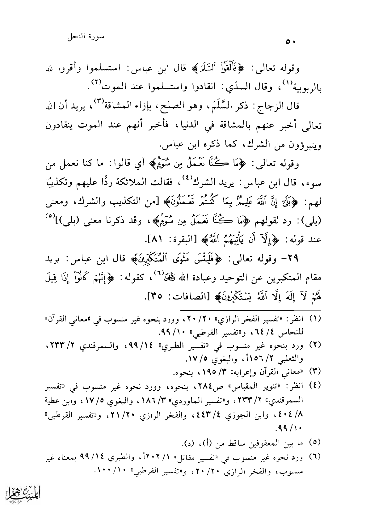 (¬4) انظر: "تنوير المقباس" ص 284، بنحوه، وورد نحوه غير منسوب في "تفسير السمرقندي" 2/ 233، و"تفسير الماوردي" 3/ 186، والبغوي 5/ 17، وابن عطية 8/ 404 وابن الجوزي 4/ 443، والفخر الرازي 20/ 21، و"تفسير القرطبي" 10/ 99.