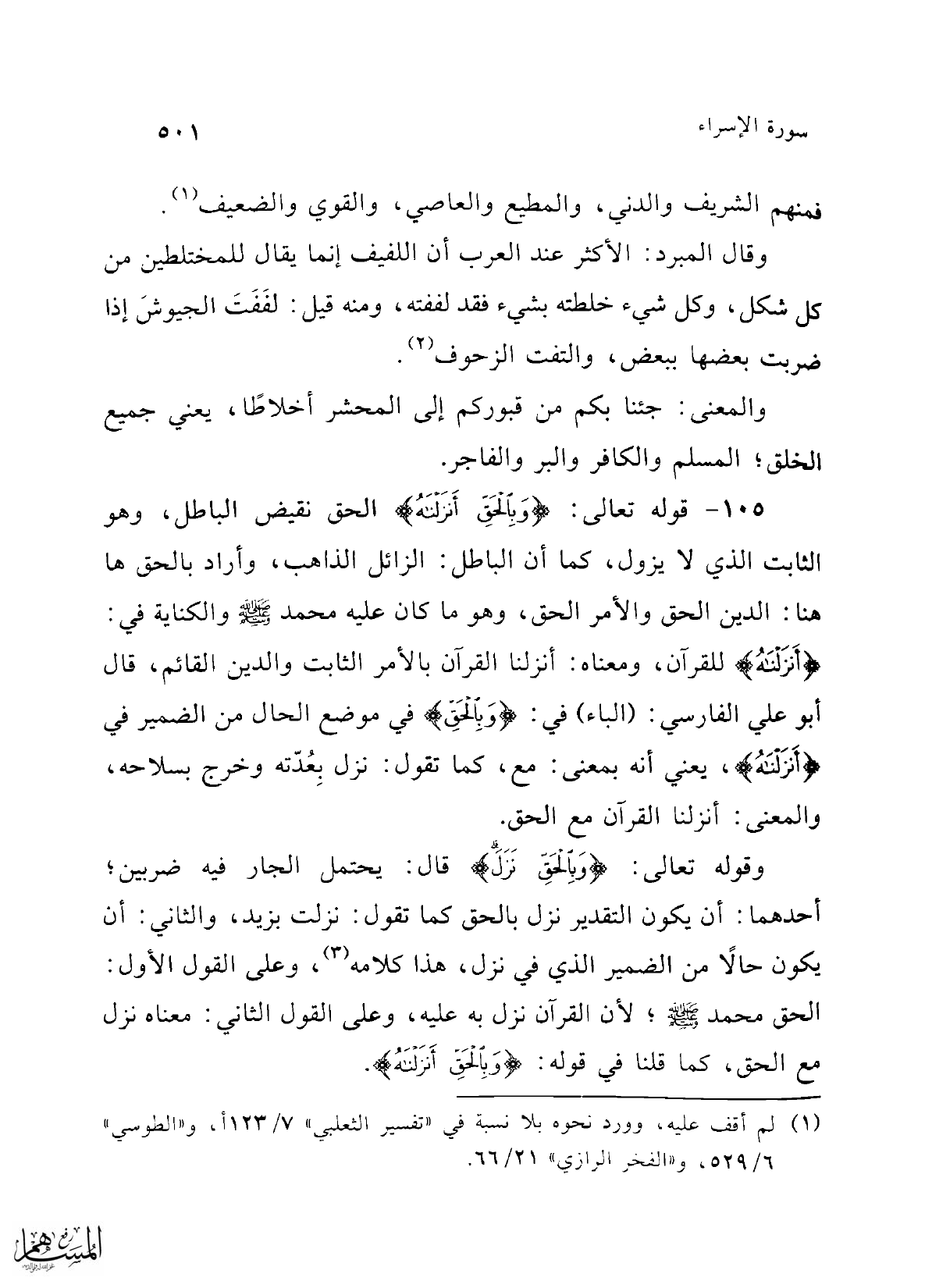 105 - قوله تعالى: {وَبِالْحَقِّ أَنْزَلْنَاهُ} الحق نقيض الباطل، وهو الثابت الذي لا يزول، كما أن الباطل: الزائل الذاهب، وأراد بالحق هنا: الدين الحق والأمر الحق، وهو ما كان عليه محمد -صلى الله عليه وسلم- والكناية في: {أَنْزَلْنَاهُ} للقرآن، ومعناه: أنزلنا القرآن بالأمر الثابت والدين القائم، قال أبو علي الفارسي: (الباء) في: {وَبِالْحَقِّ} في موضع الحال من الضمير في {أَنْزَلْنَاهُ}، يعني أنه بمعنى: مع، كما تقول: نزل بِعُدّته وخرج بسلاحه، والمعنى: أنزلنا القرآن مع الحق.