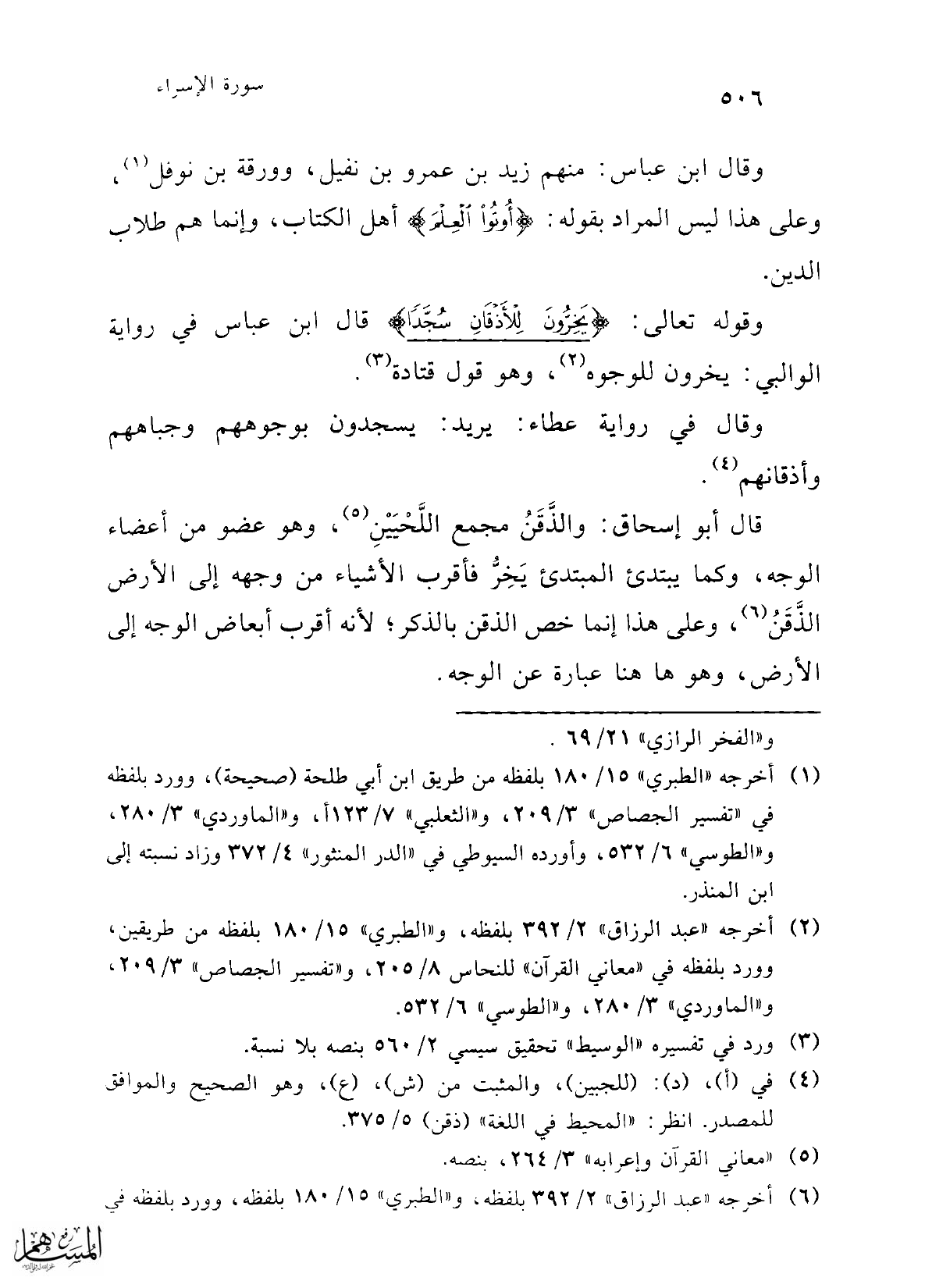وقوله تعالى: {يَخِرُّونَ لِلْأَذْقَانِ سُجَّدًا} قال ابن عباس في رواية؛ الوالبي: يخرون للوجوه (¬2)، وهو قول قتادة (¬3).