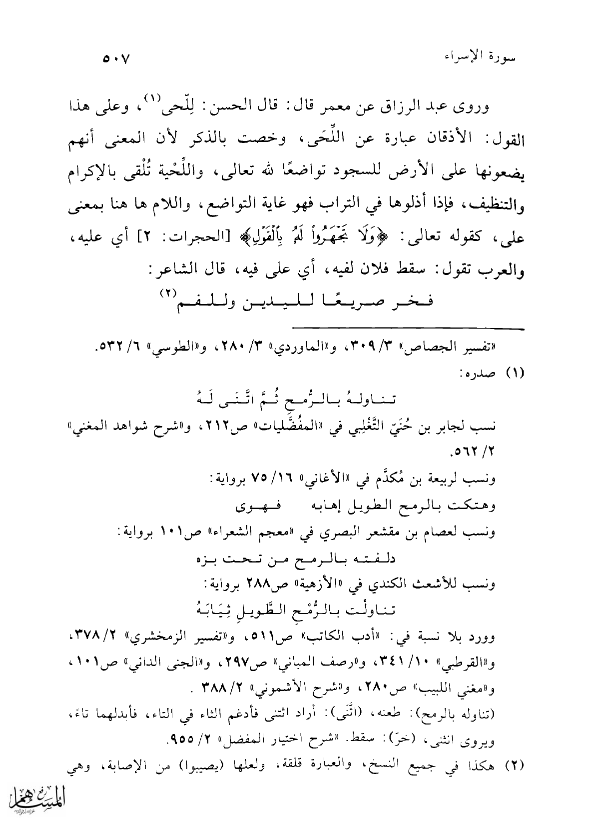 وروى عبد الرزاق عن معمر قال: قال الحسن: لِلّحى (¬1)، وعلى هذا القول: الأذقان عبارة عن اللِّحَى، وخصت بالذكر لأن المعنى أنهم يضعونها على الأرض للسجود تواضعًا لله تعالى، واللِّحْية تُلْقي بالإكرام والتنظيف، فإذا أذلوها في التراب فهو غاية التواضع، واللام هاهنا بمعنى على، كقوله تعالى: {وَلَا تَجْهَرُوا لَهُ بِالْقَوْلِ} [الحجرات: 2] أي عليه، والعرب تقول: سقط فلان لفيه، أي على فيه، قال الشاعر: