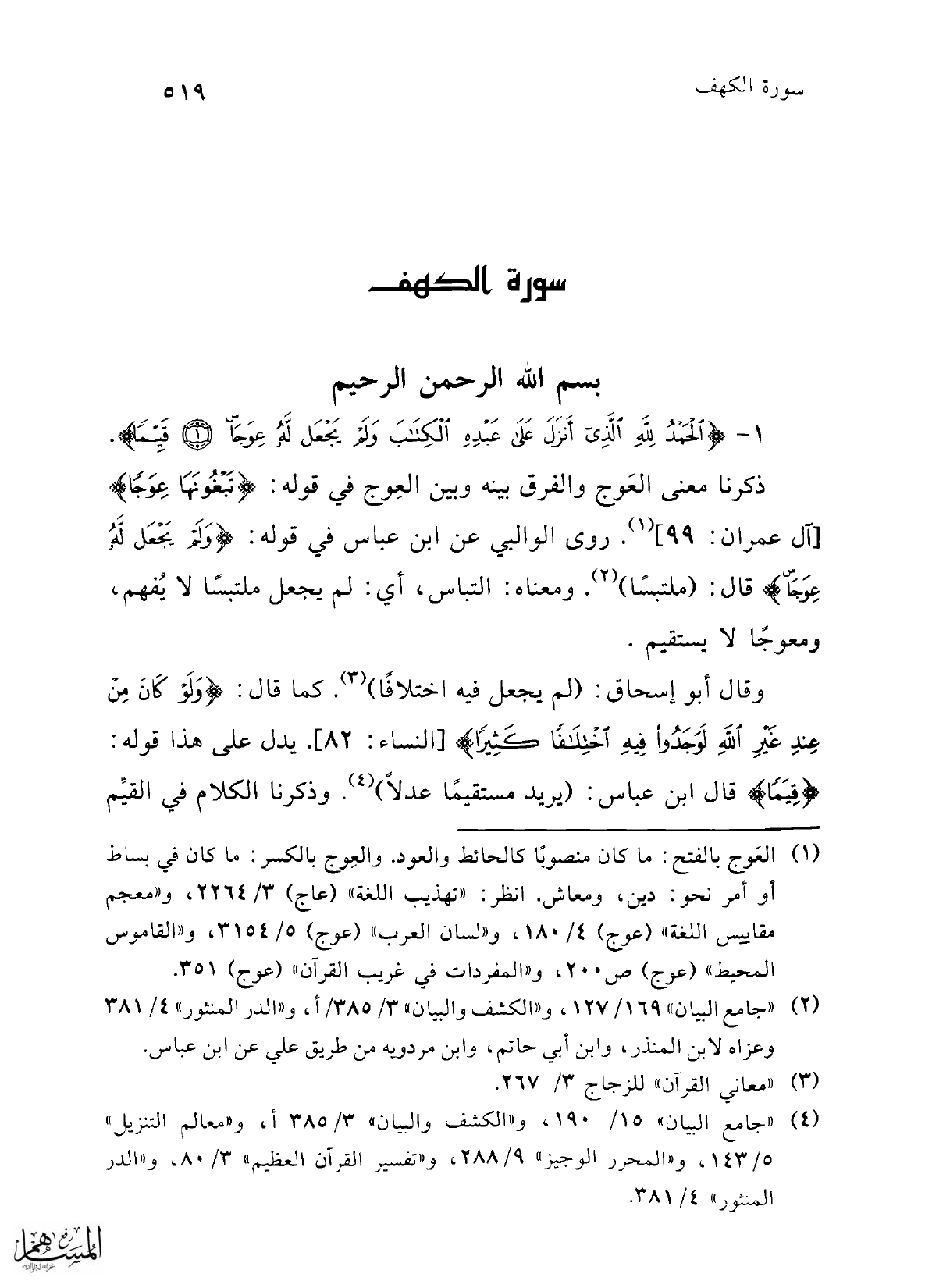 1 - {الْحَمْدُ لِلَّهِ الَّذِي أَنْزَلَ عَلَى عَبْدِهِ الْكِتَابَ وَلَمْ يَجْعَلْ لَهُ عِوَجًا (1) قَيِّمًا}.