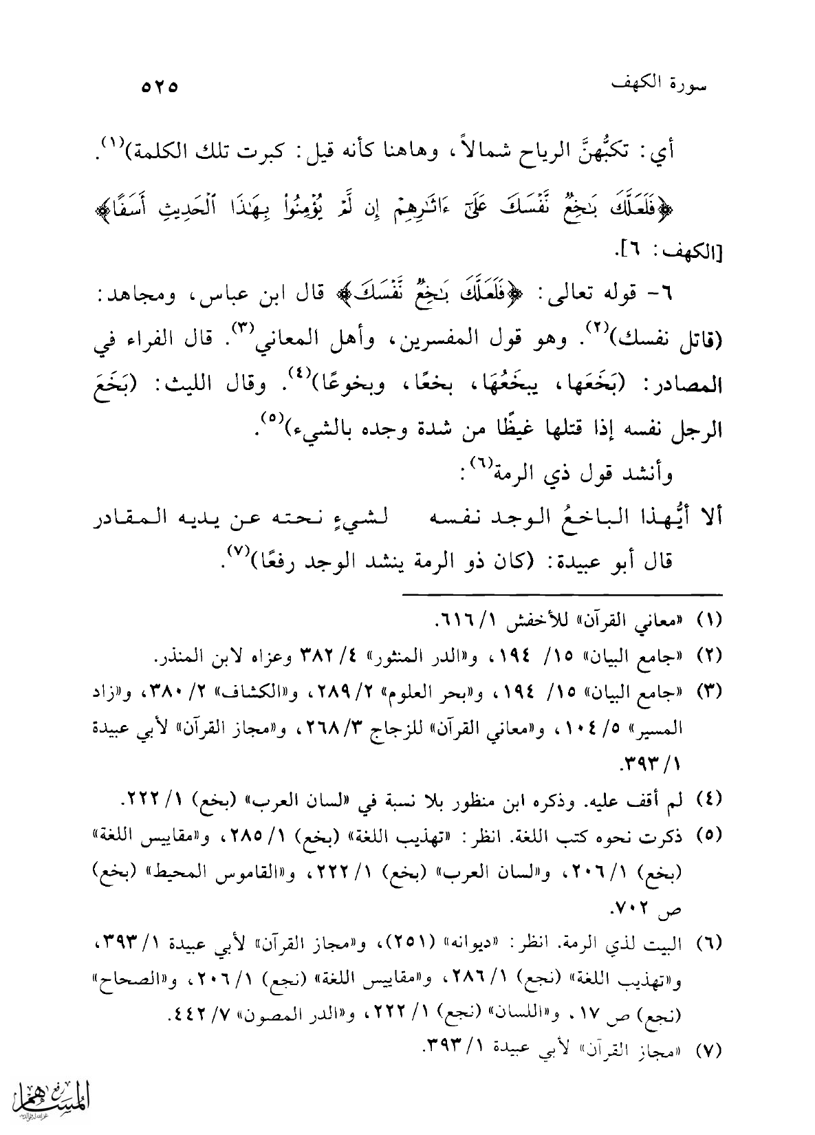 6 - قوله تعالى: {فَلَعَلَّكَ بَاخِعٌ نَفْسَكَ} قال ابن عباس، ومجاهد: (قاتل نفسك) (¬2). وهو قول المفسرين، وأهل المعاني (¬3). قال الفراء في المصادر: (بَخَعَها، يبخَعُهَا، بخعًا، وبخوعًا) (¬4). وقال الليث: (بَخَعَ الرجل نفسه إذا قتلها غيظًا من شدة وجده بالشيء) (¬5).