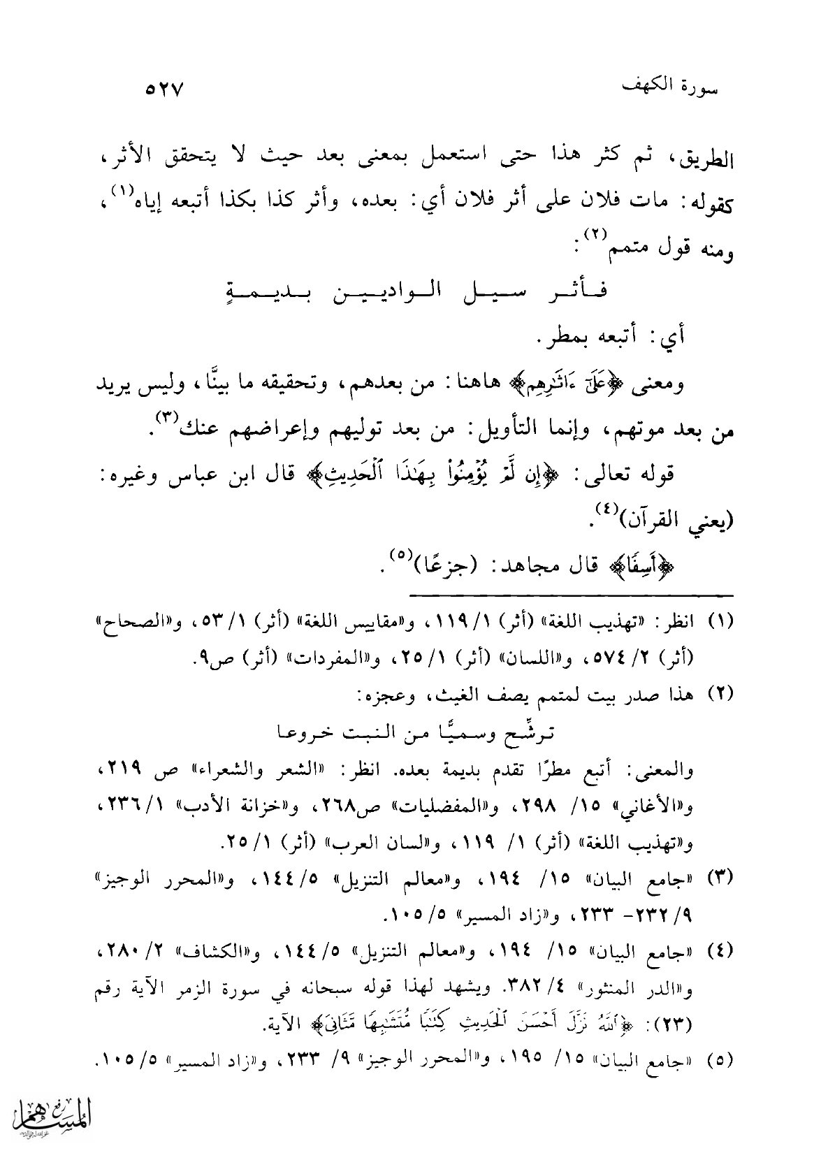 الطريق، ثم كثر هذا حتى استعمل بمعنى بعد حيث لا يتحقق الأثر، كقول: مات فلان على أثر فلان أي: بعده، وأثر كذا بكذا أتبعه إياه (¬1)، ومنه قول متمم (¬2):