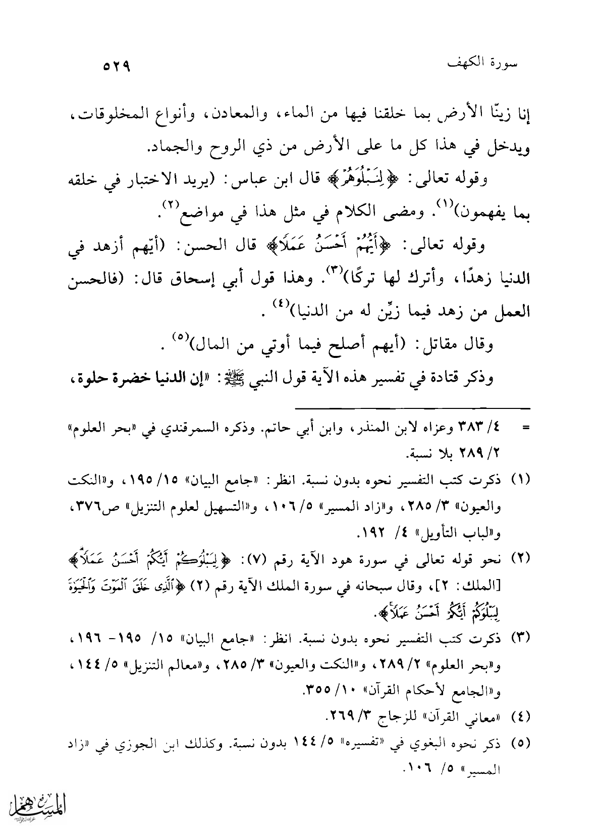 وذكر قتادة في تفسير هذه الآية قول النبي -صلى الله عليه وسلم-: "إن الدنيا خضرة حلوة،