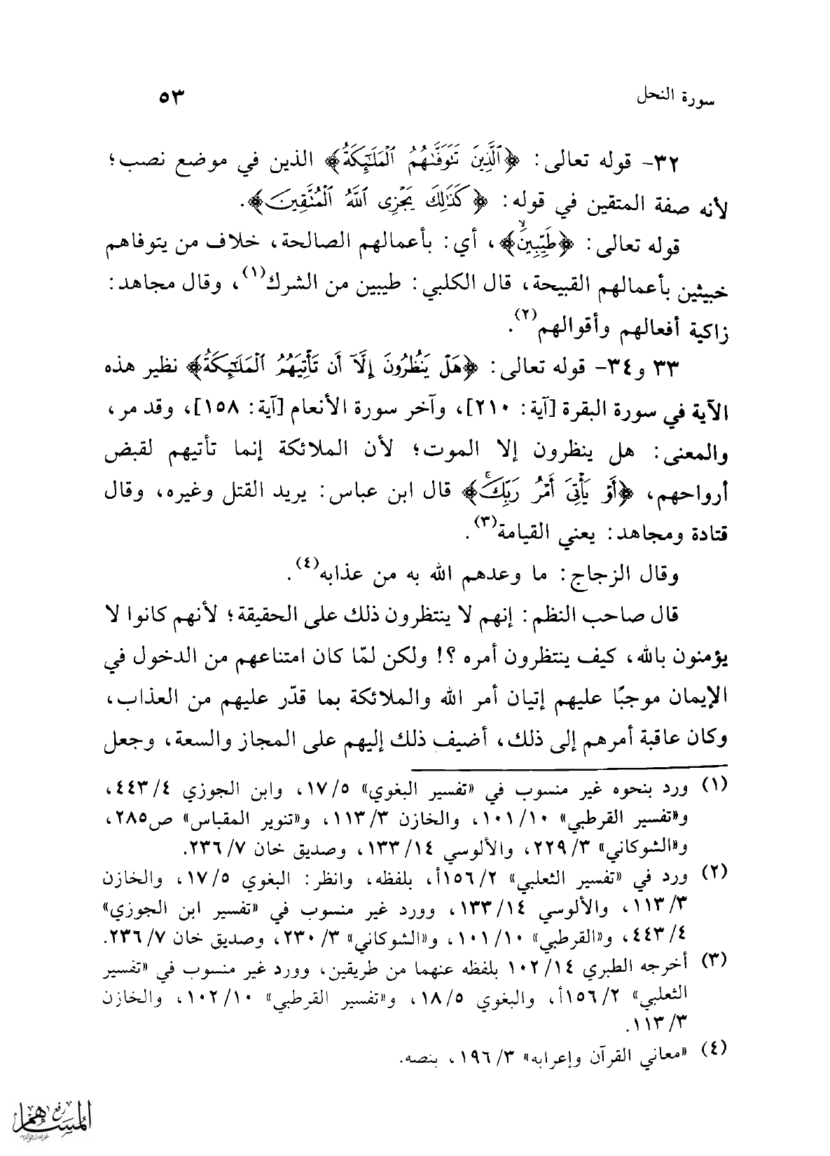 32 - قوله تعالى: {الَّذِينَ تَتَوَفَّاهُمُ الْمَلَائِكَةُ} الذين في موضع نصب؛ لأنه صفة المتقين في قوله: {كَذَلِكَ يَجْزِي اللَّهُ الْمُتَّقِينَ}.