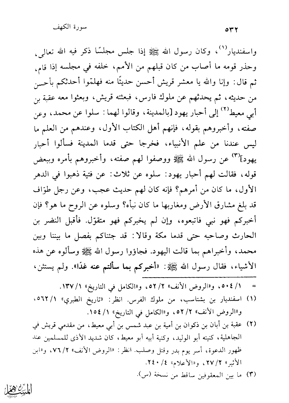 واسفنديار (¬1)، وكان رسول الله -صلى الله عليه وسلم- إذا جلس مجلسًا ذكر فيه الله تعالى، وحذر قومه ما أصاب من كان قبلهم من الأمم، خلفه في مجلسه إذا قام، ثم قال: وإنا والله يا معشر قريش أحسن حديثًا منه فهلمّوا أحدثكم بأحسن من حديثه، ثم يحدثهم عن ملوك فارس، فبعثته قريش، وبعثوا معه عقبة بن أبي معيط (¬2) إلى أحبار يهود [بالمدينة، وقالوا لهما: سلوا عن محمد، وعن صفته، وأخبروهم بقوله، فإنهم أهل الكتاب الأول، وعندهم من العلم مما ليس عندنا من علم الأنبياء، فخرجا حتى قدما المدينة فسألوا أحبار يهود] (¬3) عن رسول الله -صلى الله عليه وسلم- ووصفوا لهم صفته، وأخبروهم بأمره وببعض قوله، فقالت لهم أحبار يهود: سلوه عن ثلاث: عن فتية ذهبوا في الدهر الأول، ما كان من أمرهم؟ فإنه كان لهم حديث عجيب، وعن رجل طوّاف قد بلغ مشارق الأرض ومغاربها ما كان نبأه؟ وسلوه عن الروح ما هو؟ فإن أخبركم فهو نبي فاتبعوه، وإن لم يخبركم فهو متقوّل. فأقبل النضر بن الحارث وصاحبه حتى قدما مكة وقالا: قد جئناكم بفصل ما بيننا وبين محمد، وأخبراهم بما قالت اليهود. فجاؤوا رسول الله -صلى الله عليه وسلم- وسألوه عن هذه الأشياء، فقال رسول الله -صلى الله عليه وسلم-: "أخبركم بما سألتم عنه غدًا". ولم يستثن،