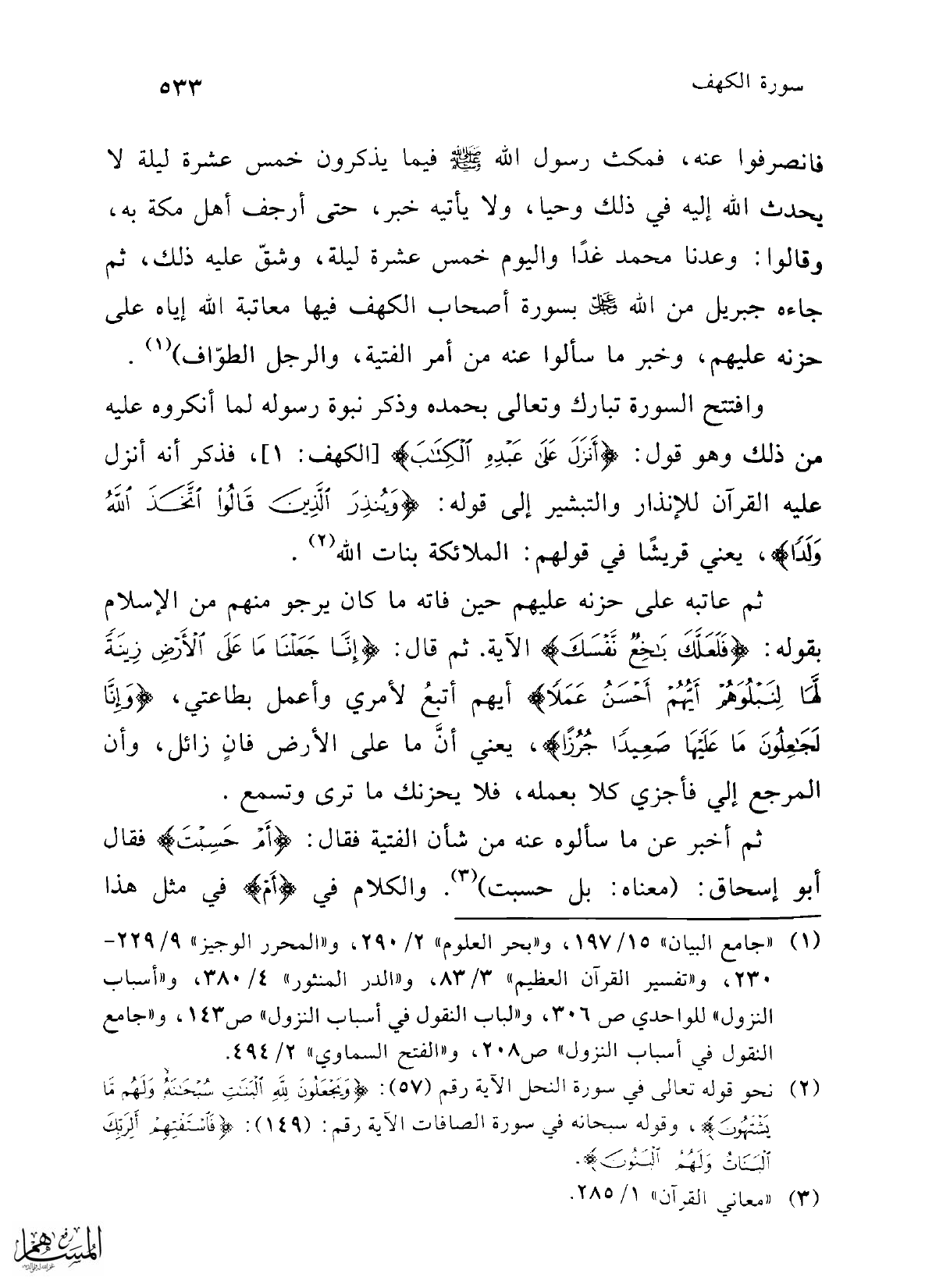 فانصرفوا عنه، فمكث رسول الله -صلى الله عليه وسلم- فيما يذكرون خمس عشرة ليلة لا يحدث الله إليه في ذلك وحيا، ولا يأتيه خبر، حتى أرجف أهل مكة به، وقالوا: وعدنا محمد غدًا واليوم خمس عشرة ليلة، وشقّ عليه ذلك، ثم جاءه جبريل من الله -عز وجل- بسورة أصحاب الكهف فيها معاتبة الله إياه على حزنه عليهم، وخبر ما سألوا عنه من أمر الفتية، والرجل الطوّاف) (¬1).