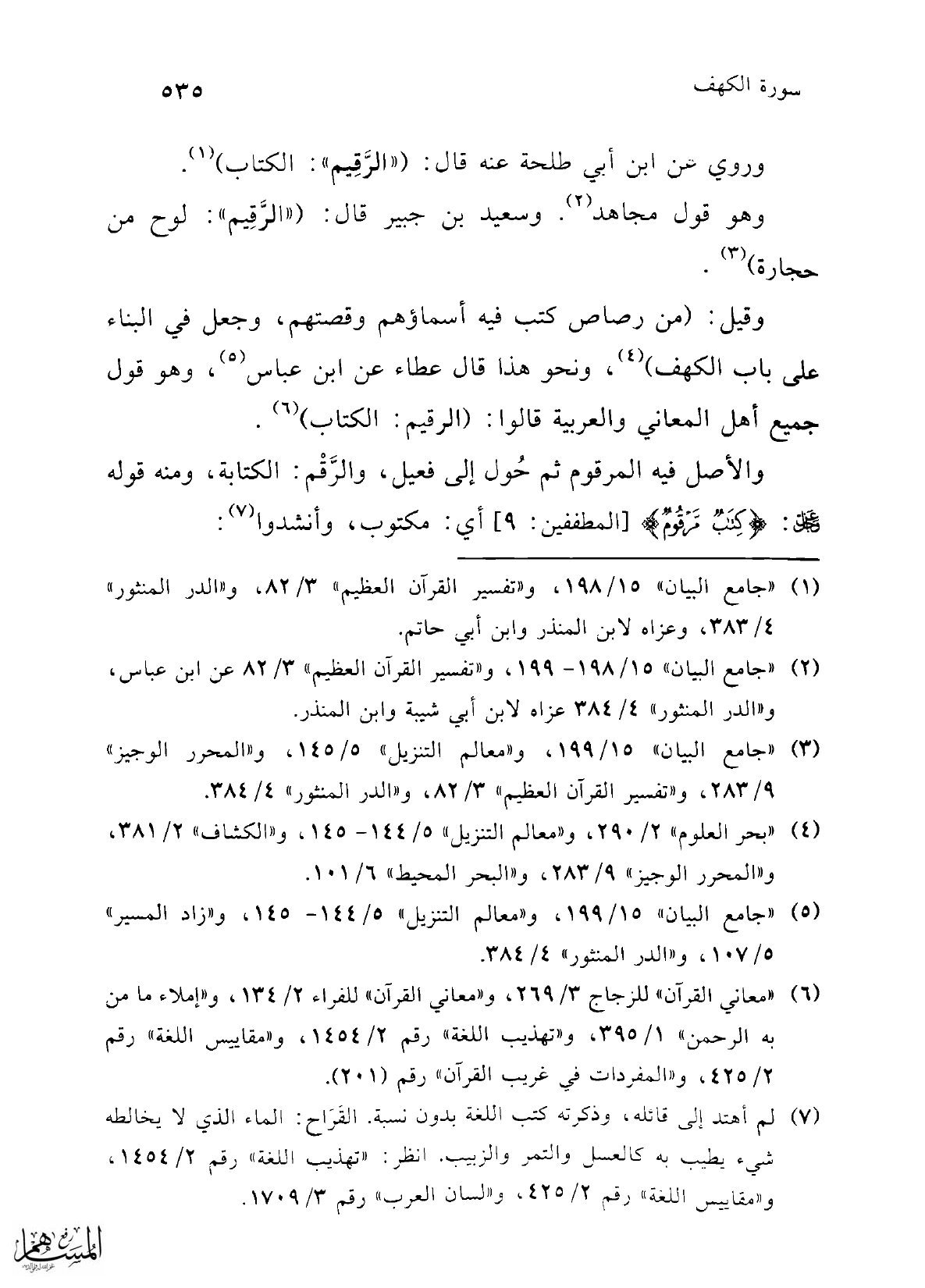 وروي كن ابن أبي طلحة عنه قال: ("الرَّقِيم": الكتاب) (¬1).