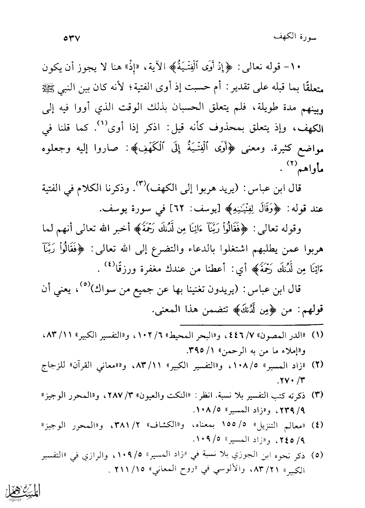 (¬1) "الدر المصون" 7/ 446، و"البحر المحيط" 6/ 102، و"التفسير الكبير" 11/ 83، و"إملاء ما من به الرحمن" 1/ 395.