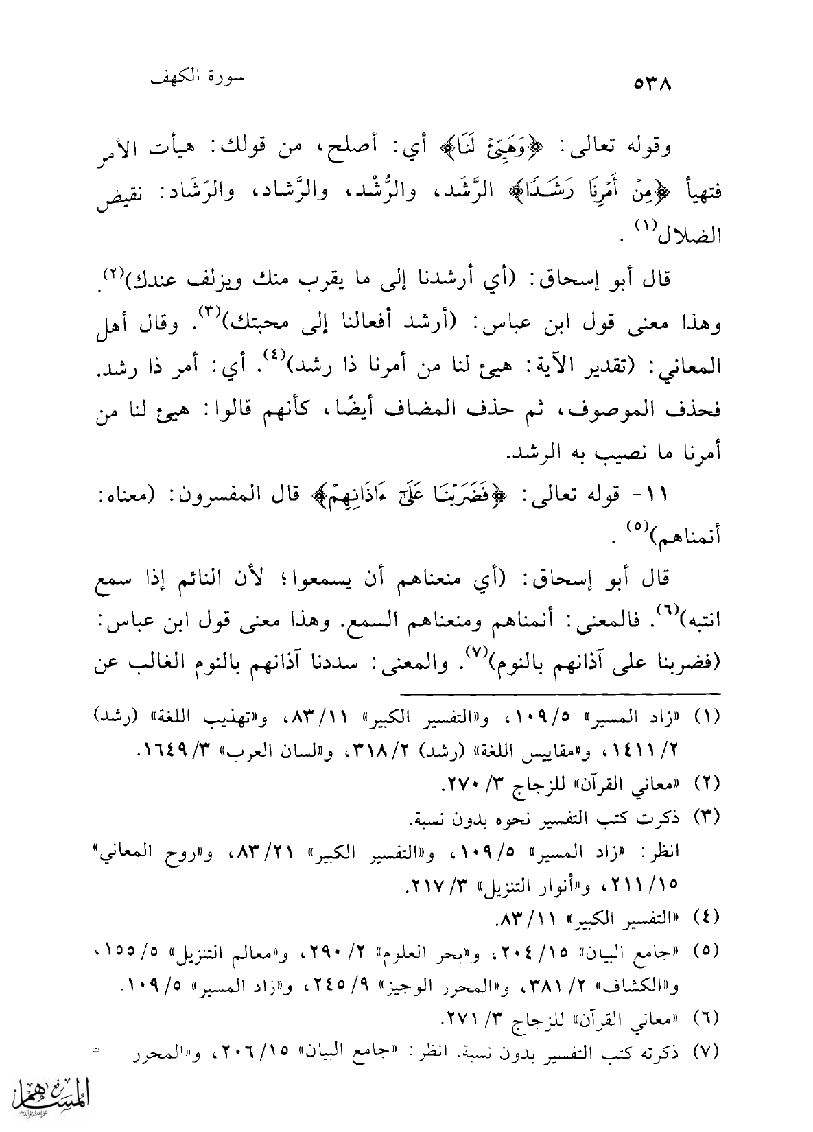 قال أبو إسحاق: (أي أرشدنا إلى ما يقرب منك ويزلف عندك) (¬2) وهذا معنى قول ابن عباس: (أرشد أفعالنا إلى محبتك) (¬3). وقال أهل المعاني: (تقدير الآية: هيئ لنا من أمرنا ذا رشد) (¬4). أي: أمر ذا رشد. فحذف الموصوف، ثم حذف المضاف أيضًا، كأنهم قالوا: هيئ لنا من أمرنا ما نصيب به الرشد.