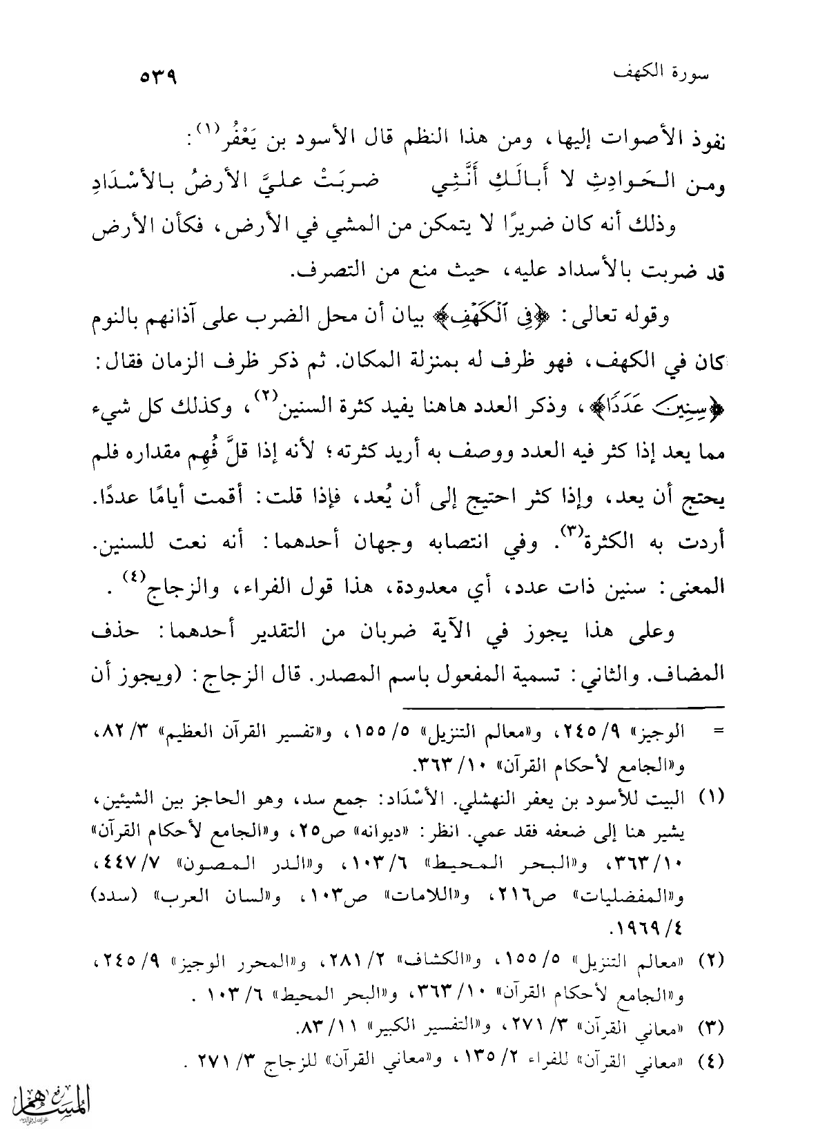 وقوله تعالى: {فِي الْكَهْفِ} بيان أن محل الضرب على آذانهم بالنوم كان في الكهف، فهو ظرف له بمنزلة المكان. ثم ذكر ظرف الزمان فقال: {سِنِينَ عَدَدًا}، وذكر العدد هاهنا يفيد كثرة السنين (¬2)، وكذلك كل شيء مما يعد إذا كثر فيه العدد ووصف به أريد كثرته؛ لأنه إذا قلَّ فُهِم مقداره فلم يحتج أن يعد، وإذا كثر احتيج إلى أن يُعد، فإذا قلت: أقمت أيامًا عددًا. أردت به الكثرة (¬3). وفي انتصابه وجهان أحدهما: أنه نعت للسنين. المعنى: سنين ذات عدد، أي معدودة، هذا قول الفراء، والزجاج (¬4).