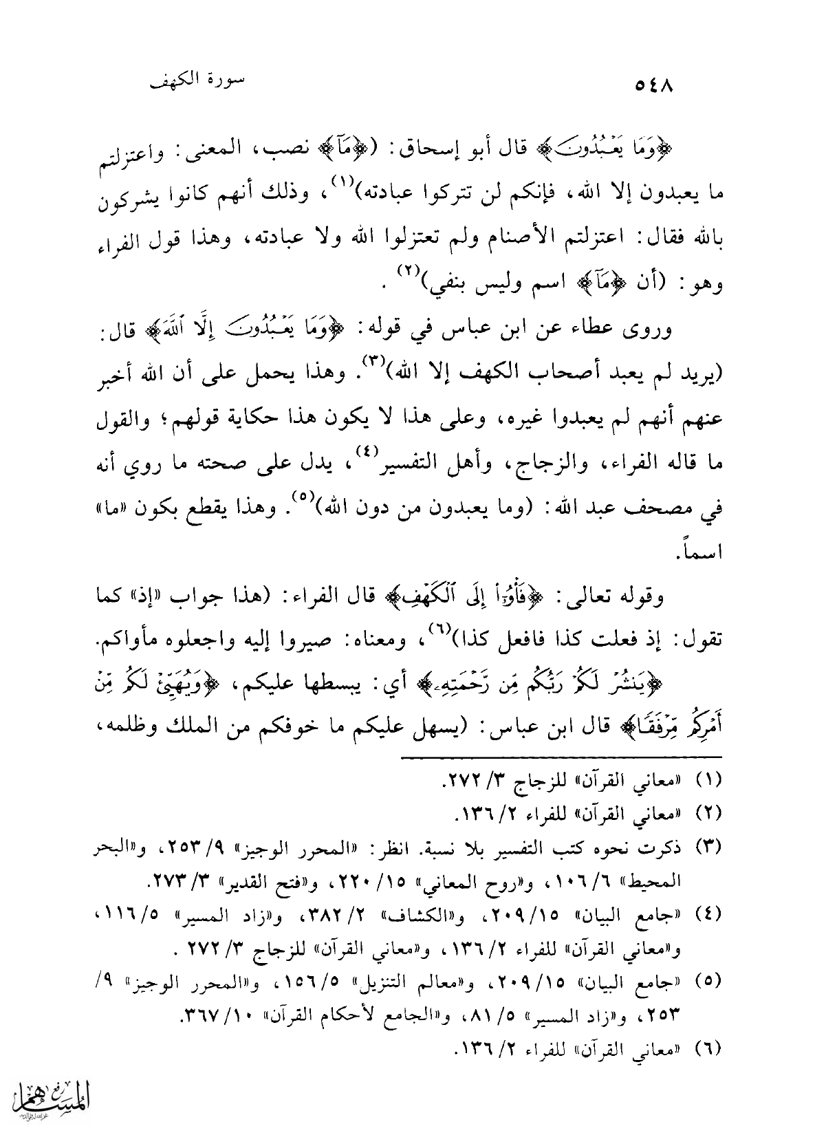 {وَمَا يَعْبُدُونَ} قال أبو إسحاق: ({مَا} نصب، المعنى: واعتزلتم ما يعبدون إلا الله، فإنكم لن تتركوا عبادته) (¬1)، وذلك أنهم كانوا يشركون بالله فقال: اعتزلتم الأصنام ولم تعتزلوا الله ولا عبادته، وهذا قول الفراء وهو: (أن {مَا} اسم وليس بنفي) (¬2).