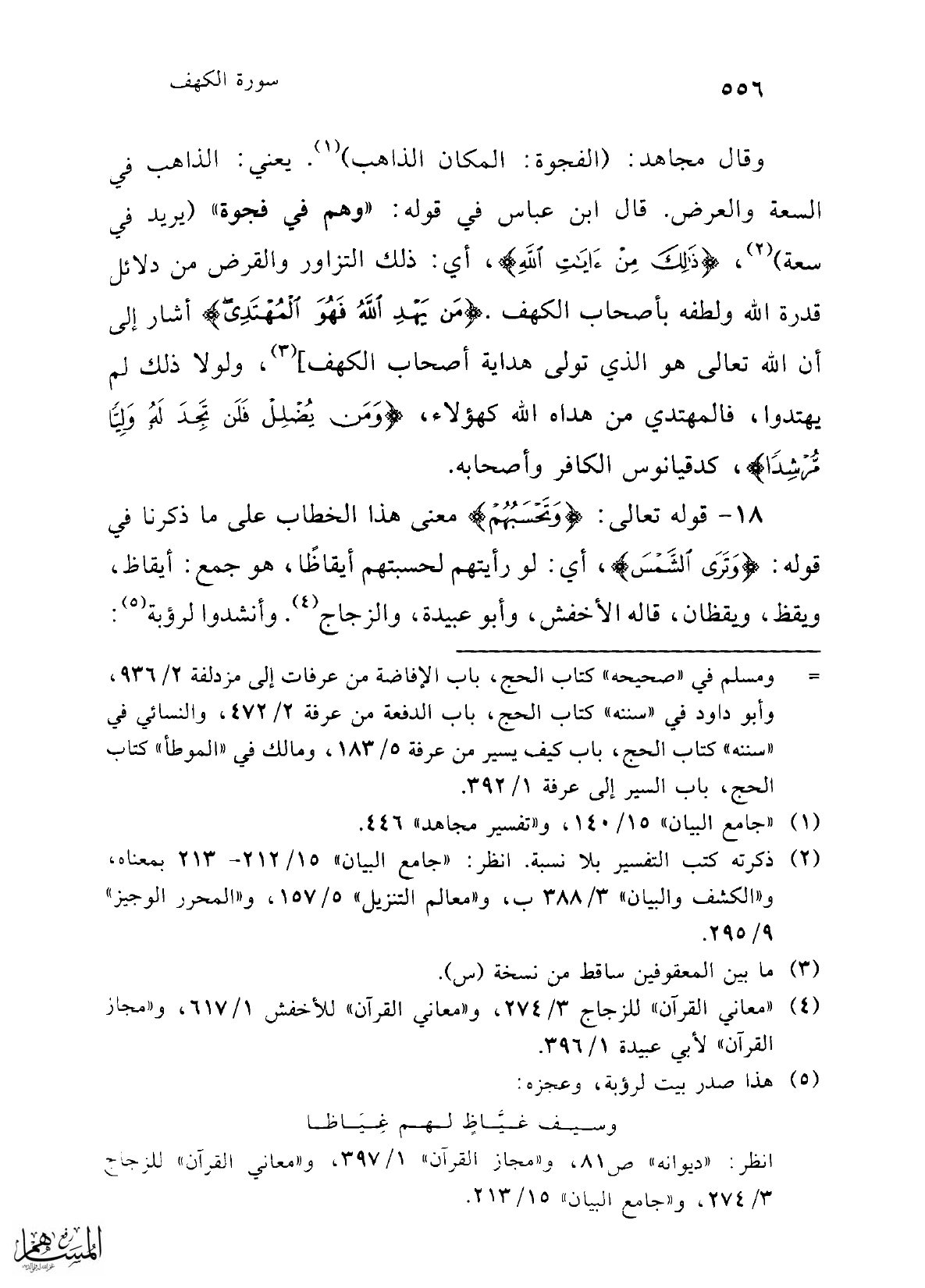 وقال مجاهد: (الفجوة: المكان الذاهب) (¬1). يعني: الذاهب في السعة والعرض. قال ابن عباس في قوله: "وهم في فجوة" (يريد في سعة) (¬2)، {ذَلِكَ مِنْ آيَاتِ اللَّهِ}، أي: ذلك التزاور والقرض من دلائل قدرة الله ولطفه بأصحاب الكهف. {مَنْ يَهْدِ اللَّهُ فَهُوَ الْمُهْتَد} أشار إلى أن الله تعالى هو الذي تولى هداية أصحاب الكهف] (¬3)، ولولا ذلك لم يهتدوا، فالمهتدي من هداه الله كهؤلاء، {وَمَنْ يُضْلِلْ فَلَنْ تَجِدَ لَهُ وَلِيًّا مُرْشِدًا}، كدقيانوس الكافر وأصحابه.
