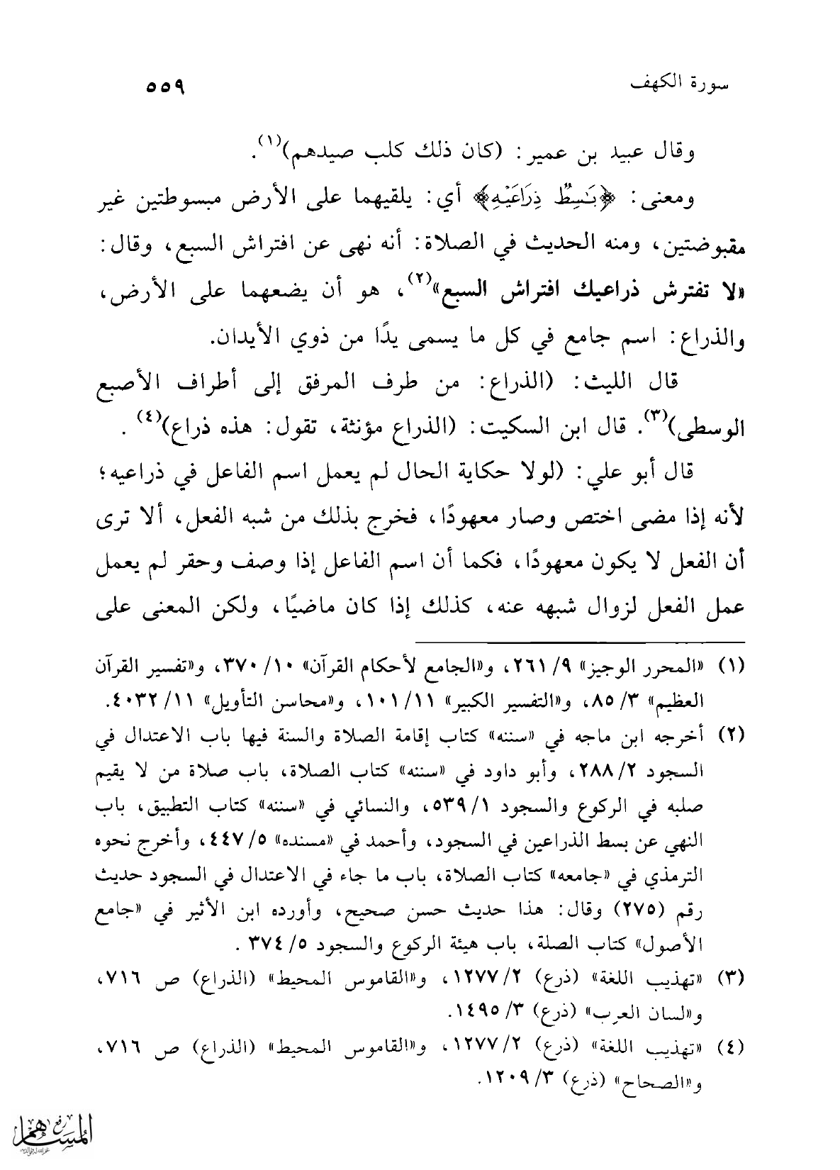 ومعنى: {بَاسِطٌ ذِرَاعَيْهِ} أي: يلقيهما على الأرض مبسوطتين غير مقبوضتين، ومنه الحديث في الصلاة: أنه نهى عن افتراش السبع، وقال: "لا تفترش ذراعيك افتراش السبع" (¬2)، هو أن يضعهما على الأرض، والذراع: اسم جامع في كل ما يسمى يدًا من ذوي الأيدان.