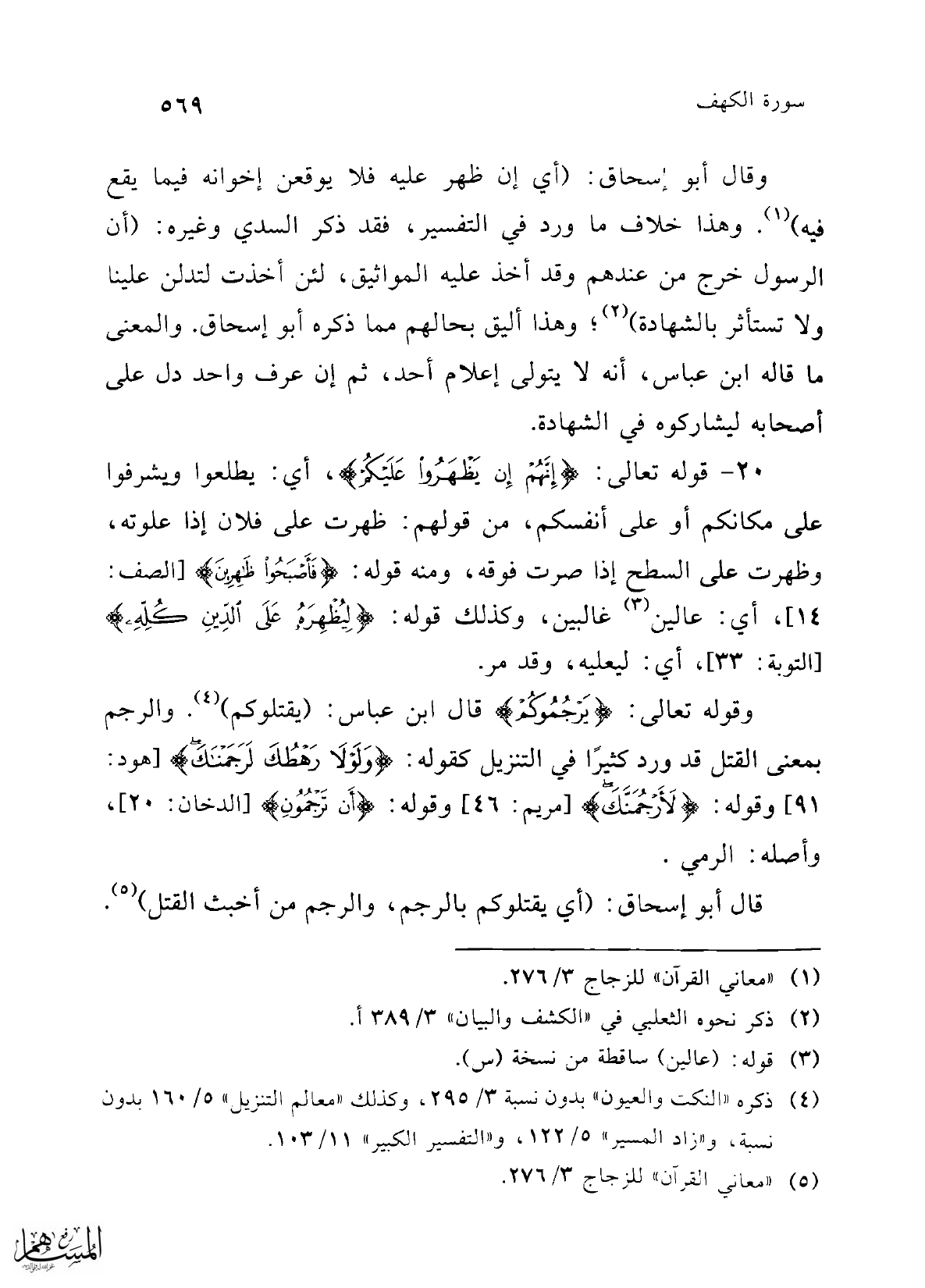 20 - قوله تعالى: {إِنَّهُمْ إِنْ يَظْهَرُوا عَلَيْكُمْ}، أي: يطلعوا ويشرفوا على مكانكم أو على أنفسكم، من قولهم: ظهرت على فلان إذا علوته، وظهرت على السطح إذا صرت فوقه، ومنه قوله: {فَأَصْبَحُوا ظَاهِرِينَ} [الصف: 14]، أي: عالين (¬3) غالبين، وكذلك قوله: {لِيُظْهِرَهُ عَلَى الدِّينِ كُلِّهِ} [التوبة: 33]، أي: ليعليه، وقد مر.
