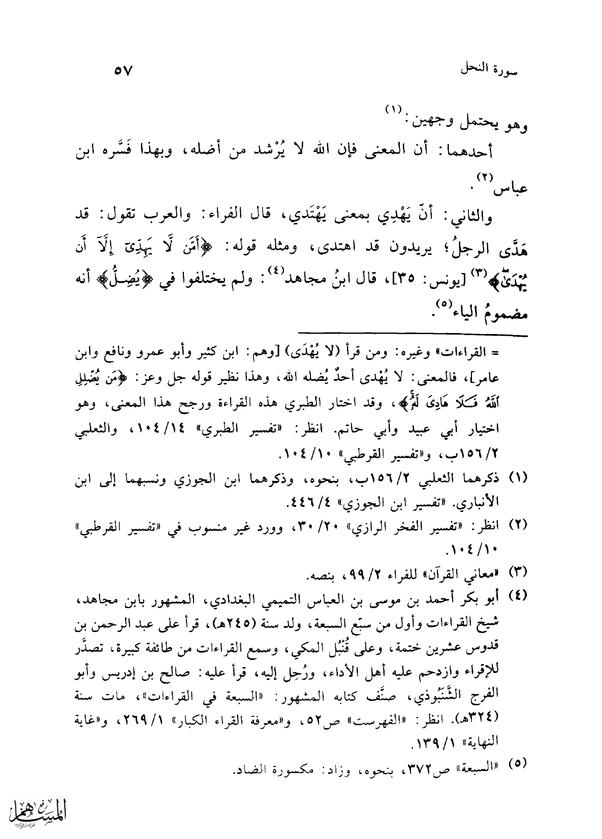 = القراءات" وغيره: ومن قرأ (لا يُهْدَى) [وهم: ابن كثير وأبو عمرو ونافع وابن عامر]، فالمعنى: لا يُهْدى أحدٌ يُضله الله، وهذا نظير قوله جل وعز: {مَنْ يُضْلِلِ اللَّهُ فَلَا هَادِيَ لَهُ}، وقد اختار الطبري هذه القراءة ورجح هذا المعنى، وهو اختيار أبي عبيد وأبي حاتم. انظر: "تفسير الطبري" 14/ 104، والثعلبي 2/ 156 ب، و"تفسير القرطبي" 10/ 104.