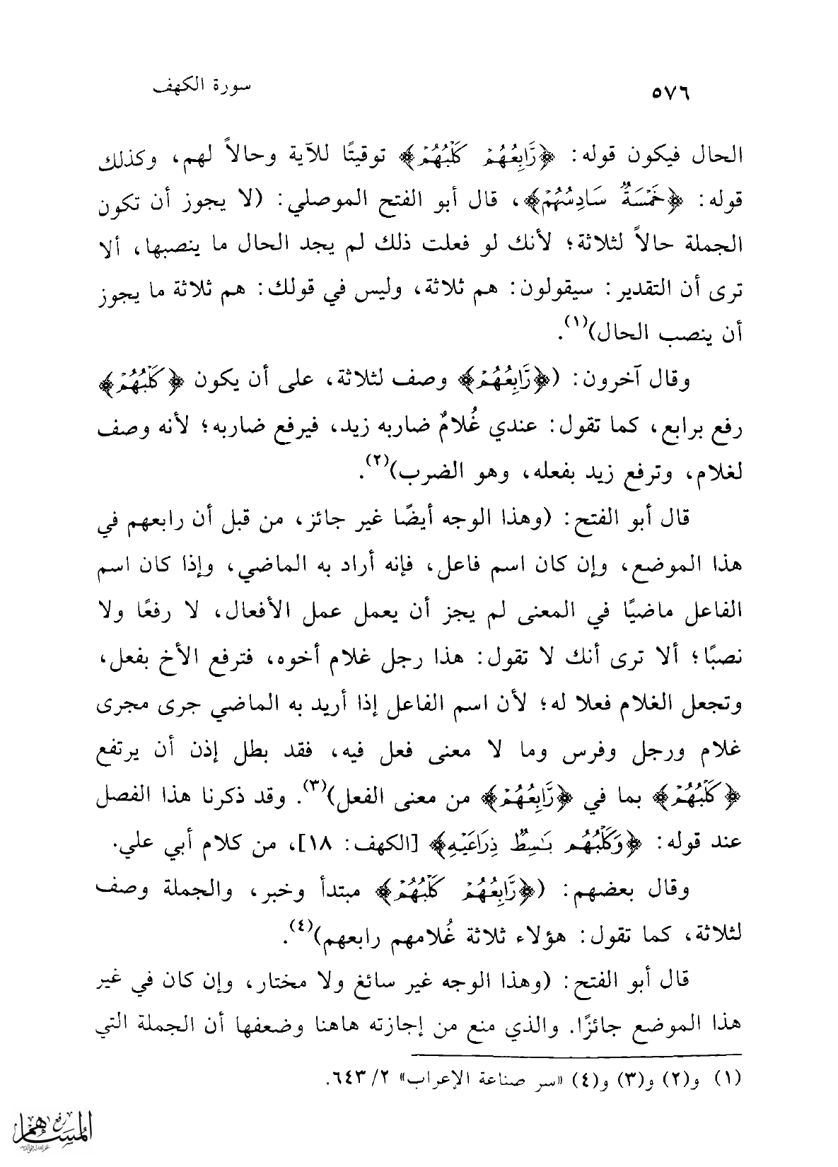 قال أبو الفتح: (وهذا الوجه أيضًا غير جائز، من قبل أن رابعهم في هذا الموضع، وإن كان اسم فاعل، فإنه أراد به الماضي، وإذا كان اسم الفاعل ماضيًا في المعنى لم يجز أن يعمل عمل الأفعال، لا رفعًا ولا نصبًا؛ ألا ترى أنك لا تقول: هذا رجل غلام أخوه، فترفع الأخ بفعل، وتجعل الغلام فعلا له؛ لأن اسم الفاعل إذا أريد به الماضي جرى مجرى غلام ورجل وفرس وما لا معنى فعل فيه، فقد بطل إذن أن يرتفع {كَلْبُهُمْ} بما في {رَابِعُهُمْ} من معنى الفعل) (3). وقد ذكرنا هذا الفصل عند قوله: {وَكَلْبُهُمْ بَاسِطٌ ذِرَاعَيْهِ} [الكهف: 18]، من كلام أبي علي.