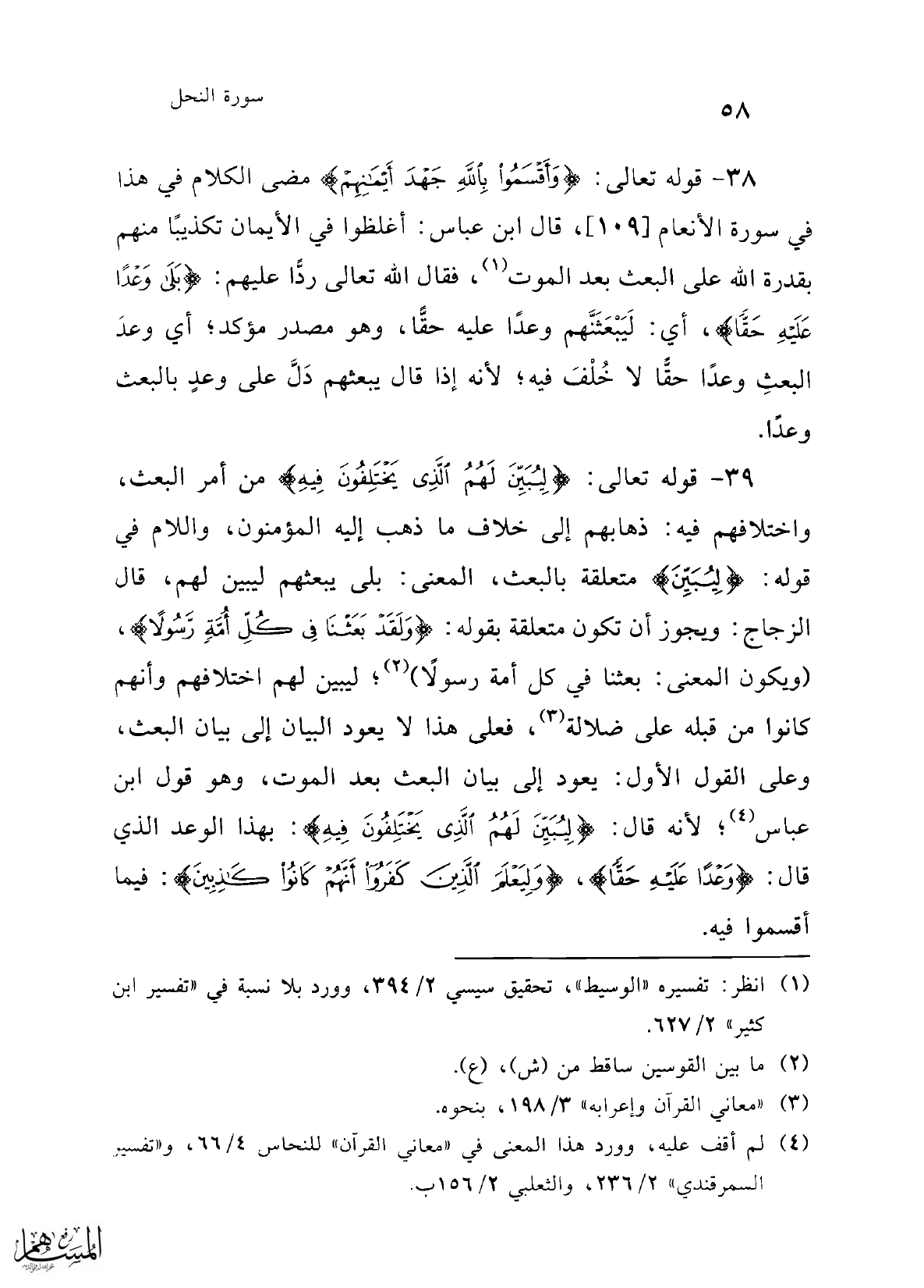 39 - قوله تعالى: {لِيُبَيِّنَ لَهُمُ الَّذِي يَخْتَلِفُونَ فِيهِ} من أمر البعث، واختلافهم فيه: ذهابهم إلى خلاف ما ذهب إليه المؤمنون، واللام في قوله: {لِيُبَيِّنَ} متعلقة بالبعث، المعنى: بلى يبعثهم ليبين لهم، قال الزجاج: ويجوز أن تكون متعلقة بقوله: {وَلَقَدْ بَعَثْنَا فِي كُلِّ أُمَّةٍ رَسُولًا}، (ويكون المعنى: بعثنا في كل أمة رسولاً) (¬2)؛ ليبين لهم اختلافهم وأنهم كانوا من قبله على ضلالة (¬3)، فعلى هذا لا يعود البيان إلى بيان البعث، وعلى القول الأول: يعود إلى بيان البعث بعد الموت، وهو قول ابن عباس (¬4)؛ لأنه قال: {لِيُبَيِّنَ لَهُمُ الَّذِي يَخْتَلِفُونَ فِيهِ}: بهذا الوعد الذي قال: {وَعْدًا عَلَيْهِ حَقًّا}، {وَلِيَعْلَمَ الَّذِينَ كَفَرُوا أَنَّهُمْ كَانُوا كَاذِبِينَ}: فيما أقسموا فيه.