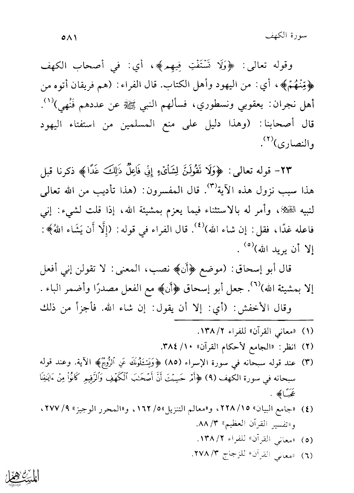 23 - قوله تعالى: {وَلَا تَقُولَنَّ لِشَيْءٍ إِنِّي فَاعِلٌ ذَلِكَ غَدًا} ذكرنا قبل هذا سبب نزول هذه الآية (¬3). قال المفسرون: (هذا تأديب من الله تعالى لنبيه -عليه السلام-، وأمر له بالاستثناء فيما يعزم بمشيئة الله، إذا قلت لشيء: إني فاعله غدًا، فقل: إن شاء الله) (¬4). قال الفراء في قوله: (إِلَّا أَن يَشَاء اللهُ}: إلا أن يريد الله) (¬5).