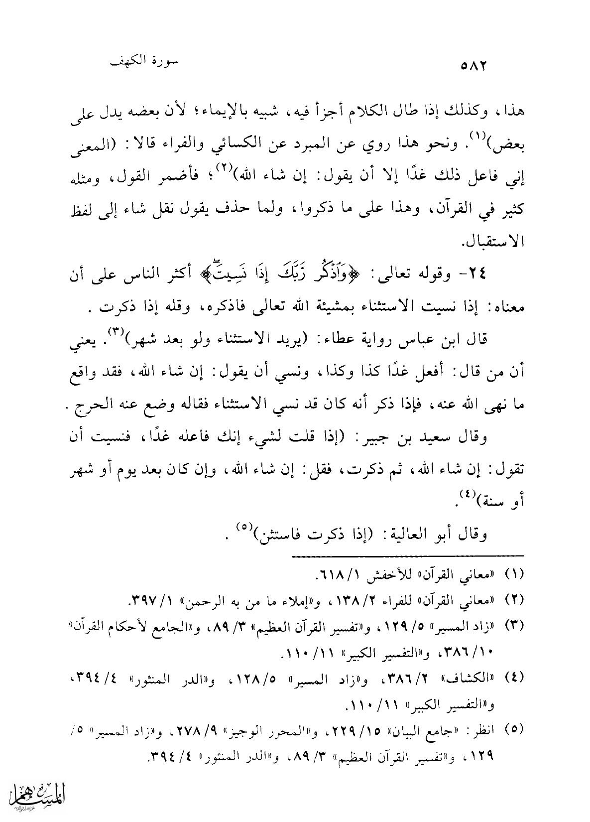 24 - وقوله تعالى: {وَاذْكُرْ رَبَّكَ إِذَا نَسِيتَ} أكثر الناس على أن معناه: إذا نسيت الاستثناء بمشيئة الله تعالى فاذكره، وقله إذا ذكرت.