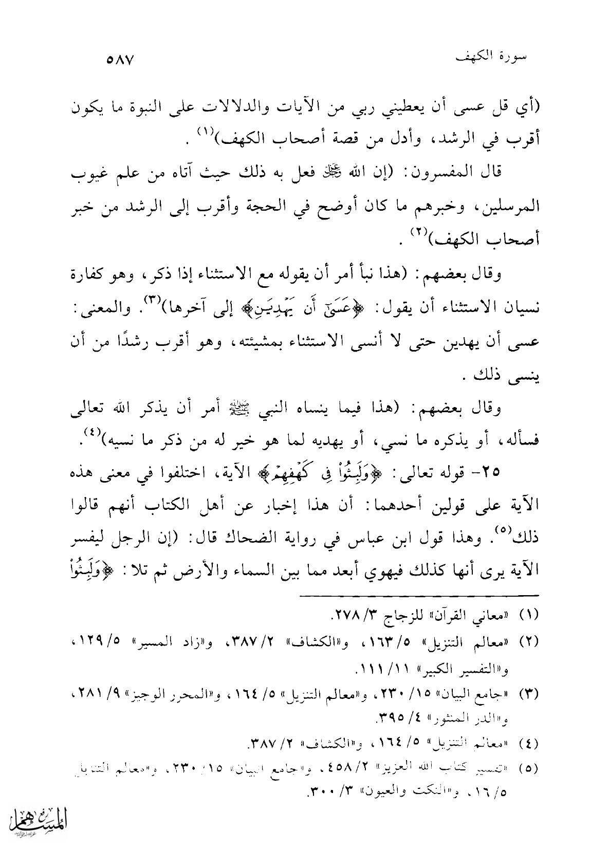 25 - قوله تعالى: {وَلَبِثُوا فِي كَهْفِهِمْ} الآية، اختلفوا في معنى هذه الآية على قولين أحدهما: أن هذا إخبار عن أهل الكتاب أنهم قالوا ذلك (¬5). وهذا قول ابن عباس في رواية الضحاك قال: (إن الرجل ليفسر الآية يرى أنها كذلك فيهوي أبعد مما بين السماء والأرض ثم تلا: {وَلَبِثُوا