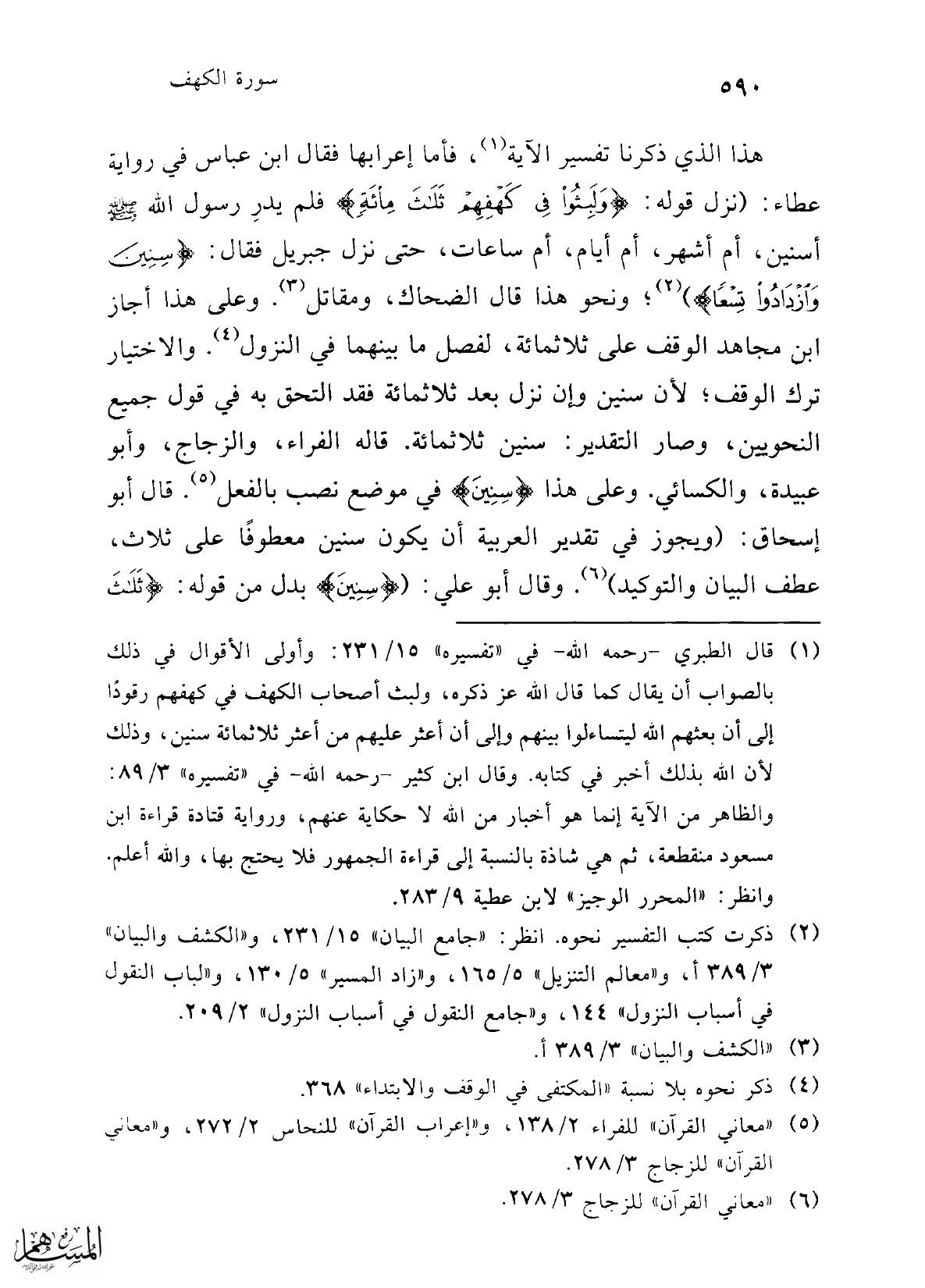 هذا الذي ذكرنا تفسير الآية (¬1)، فأما إعرابها فقال ابن عباس في رواية عطاء: (نزل قوله: {وَلَبِثُوا فِي كَهْفِهِمْ ثَلَاثَ مِائَةٍ} فلم يدرِ رسول الله -صلى الله عليه وسلم- أسنين، أم أشهر، أم أيام، أم ساعات، حتى نزل جبريل فقال: {سِنِينَ وَازْدَادُوا تِسْعًا} (¬2)؛ ونحو هذا قال الضحاك، ومقاتل (¬3). وعلى هذا أجاز ابن مجاهد الوقف على ثلاثمائة، لفصل ما بينهما في النزول (¬4). والاختيار ترك الوقف؛ لأن سنين وإن نزل بعد ثلاثمائة فقد التحق به في قول جميع النحويين، وصار التقدير: سنين ثلاثمائة. قاله الفراء، والزجاج، وأبو عبيدة، والكسائي. وعلى هذا {سِنِينَ} في موضع نصب بالفعل (¬5). قال أبو إسحاق: (ويجوز في تقدير العربية أن يكون سنين معطوفًا على ثلاث، عطف البيان والتوكيد) (¬6). وقال أبو علي: {سِنِينَ} بدل من قوله: {ثَلَاثَ