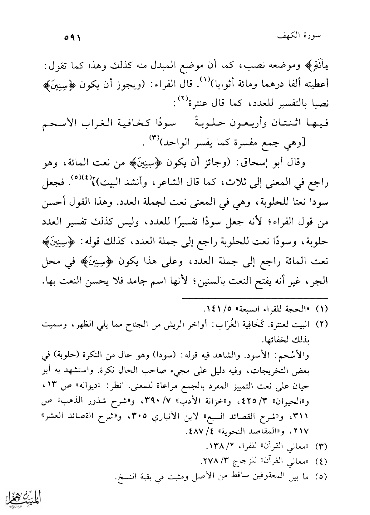 وقال أبو إسحاق: (وجائز أن يكون {سِنِينَ} من نعت المائة، وهو راجع في المعنى إلى ثلاث، كما قال الشاعر، وأنشد البيت)] (¬4) (¬5). فجعل سودا نعتا للحلوبة، وهي في المعنى نعت لجملة العدد. وهذا القول أحسن من قول الفراء؛ لأنه جعل سودًا تفسيرًا للعدد، وليس كذلك تفسير العدد حلوبة، وسودًا نعت للحلوبة راجع إلى جملة العدد، كذلك قوله: {سِنِينَ} نعت المائة راجع إلى جملة العدد، وعلى هذا يكون {سِنِينَ} في محل الجر، غير أنه يفتح النعت بالسنين؛ لأنها اسم جامد فلا يحسن النعت بها.