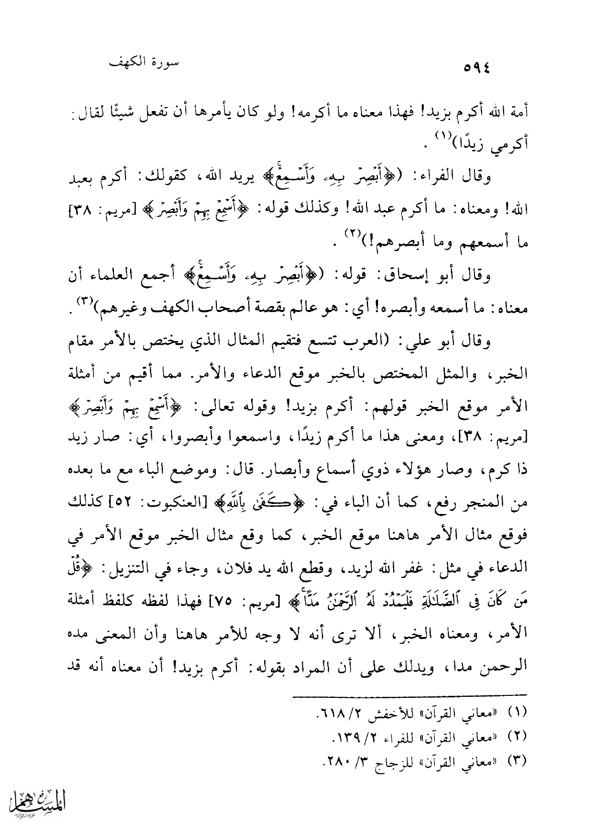 وقال الفراء: ({أَبْصِرْ بِهِ وَأَسْمِعْ} يريد الله، كقولك: أكرم بعبد الله! ومعناه: ما أكرم عبد الله! وكذلك قوله: {أَسْمِعْ بِهِمْ وَأَبْصِرْ} [مريم: 38] ما أسمعهم وما أبصرهم!) (¬2).